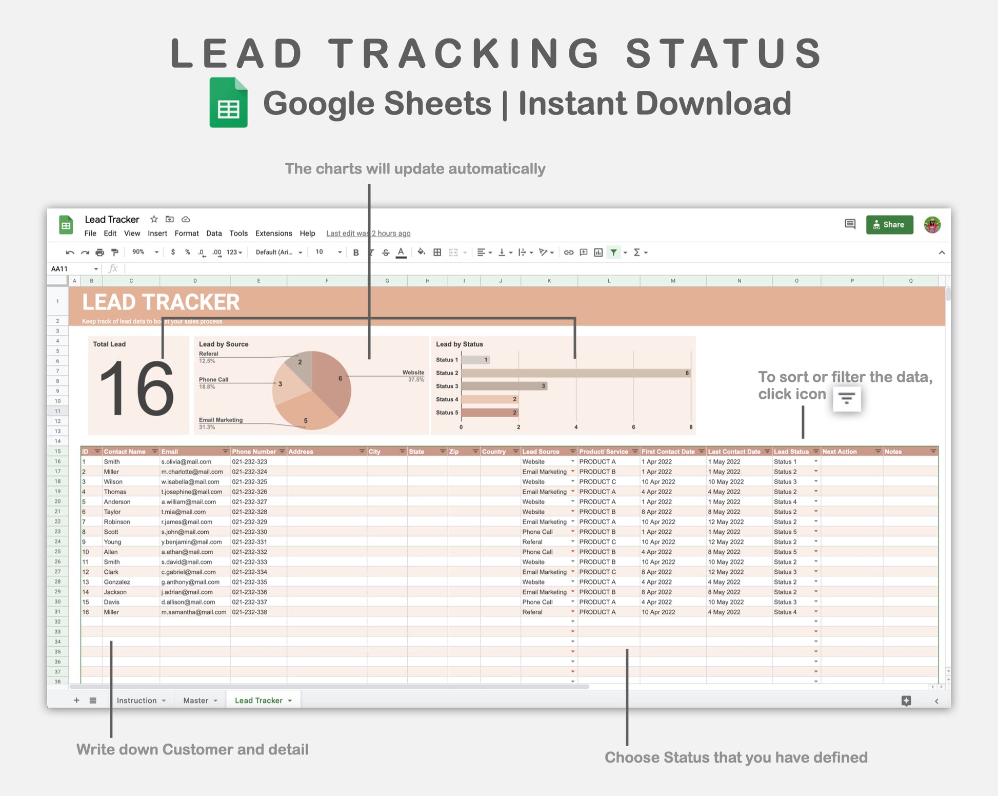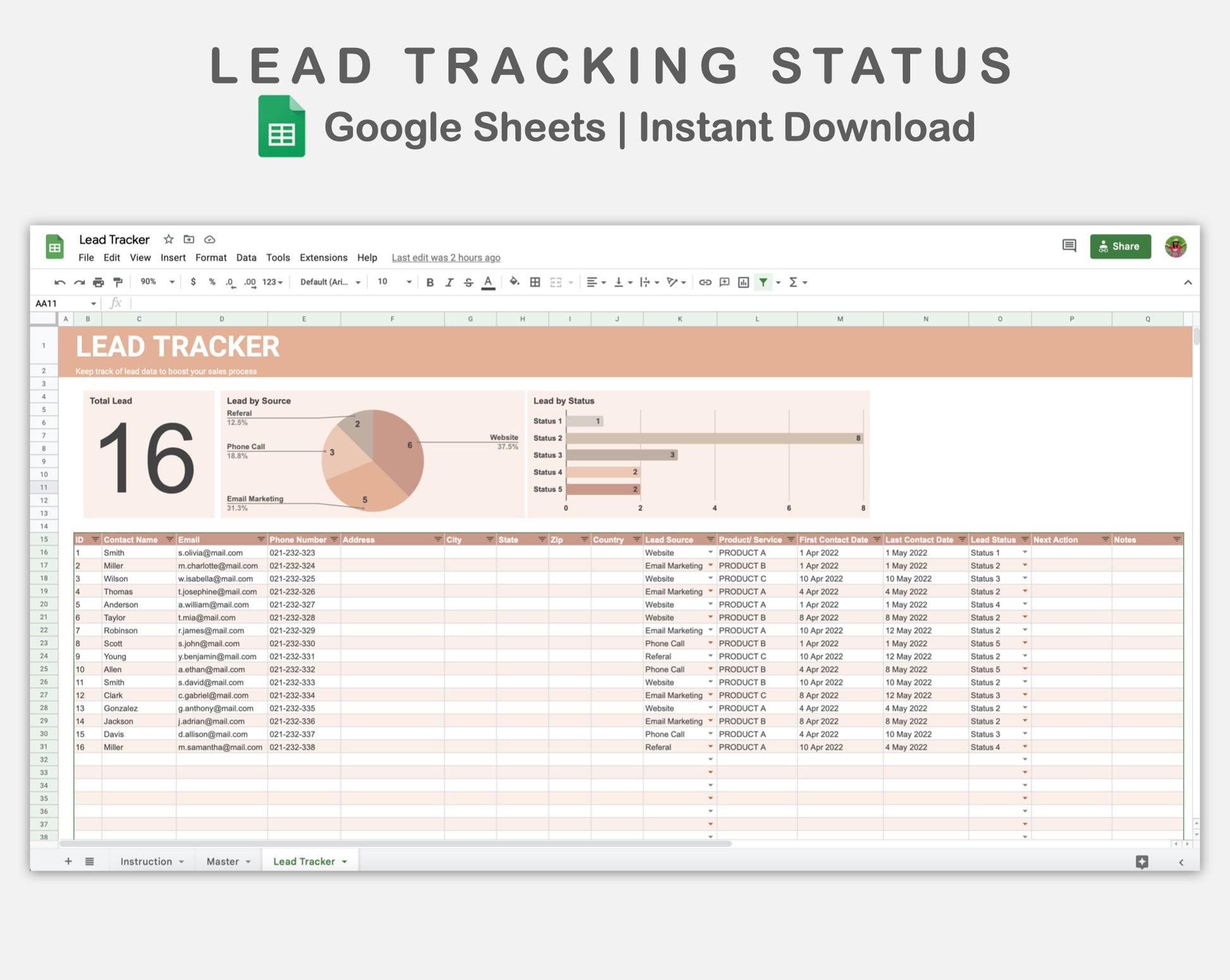 This Lead Tracking Status Spreadsheet for Google Sheets is made in NEUTRAL theme in order to help you keep track of lead data to boost your sales process.