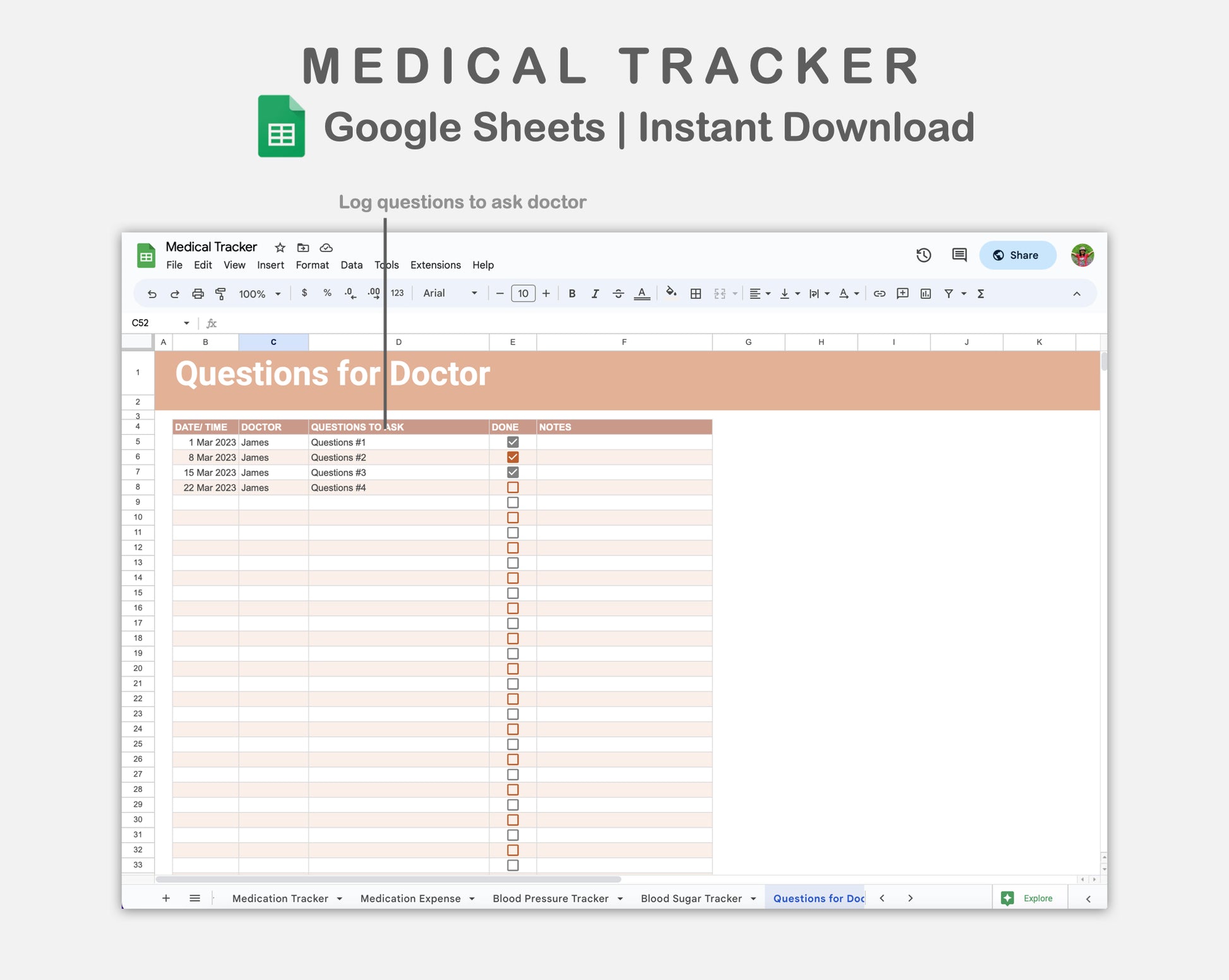 This Medical Tracker Spreadsheet for Google Sheets is made in NEUTRAL theme in order to help you keep track of your medication, medication expense, blood pressure, and blood sugar.