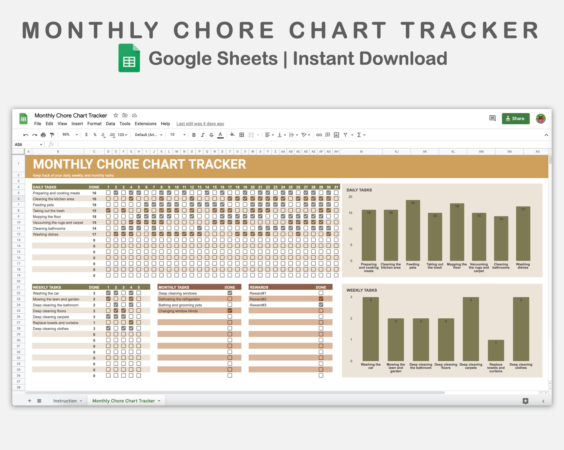Google Sheets - Monthly Chore Chart Tracker - Boho