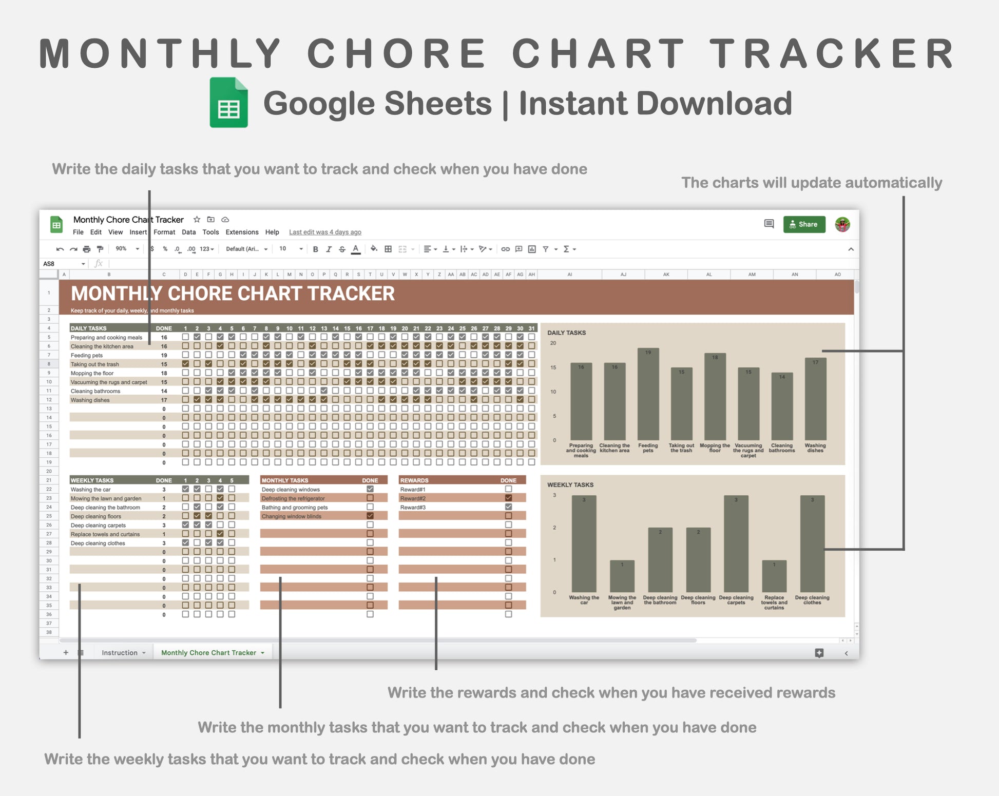This Monthly Chore Chart Tracker Spreadsheet for Google Sheets is made in EARTHY theme in order to help you track your daily, weekly, and monthly tasks.