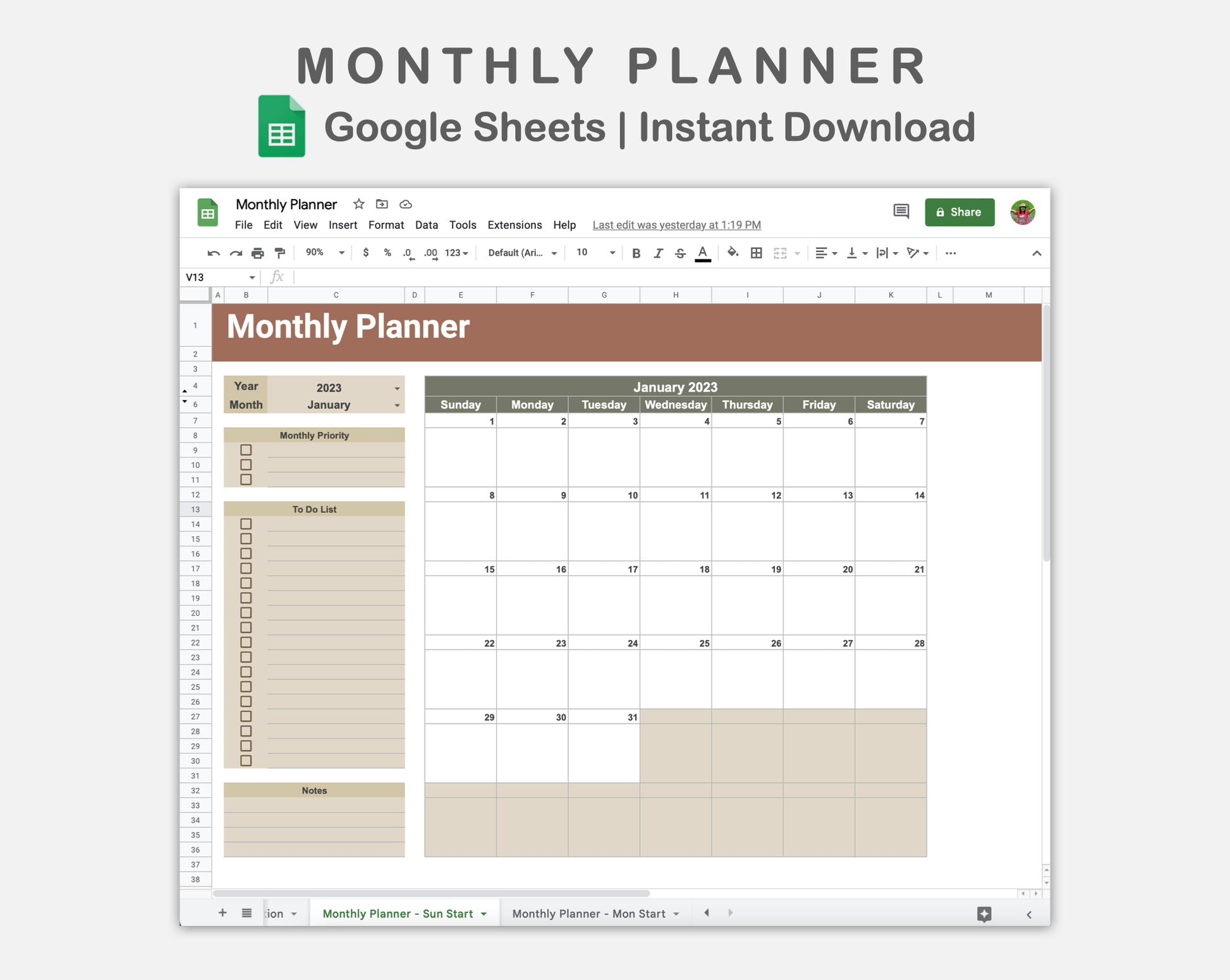 This Monthly Planner Spreadsheet for Google Sheets is made in EARTHY theme in order to help you plan, organize, and keep track of important dates and events. It is available both Sunday Start and Monday Start.