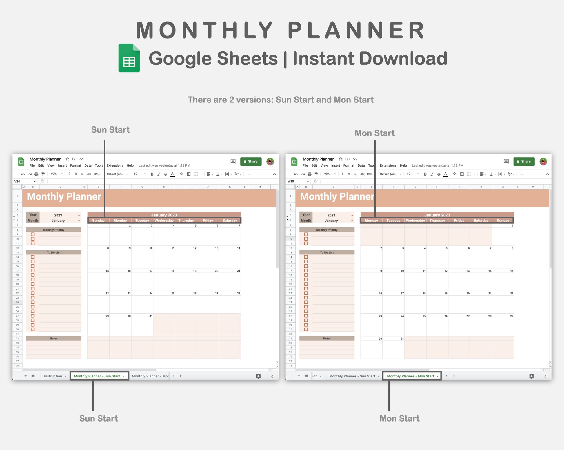 This Monthly Planner Spreadsheet for Google Sheets is made in NEUTRAL theme in order to help you plan, organize, and keep track of important dates and events. It is available both Sunday Start and Monday Start.