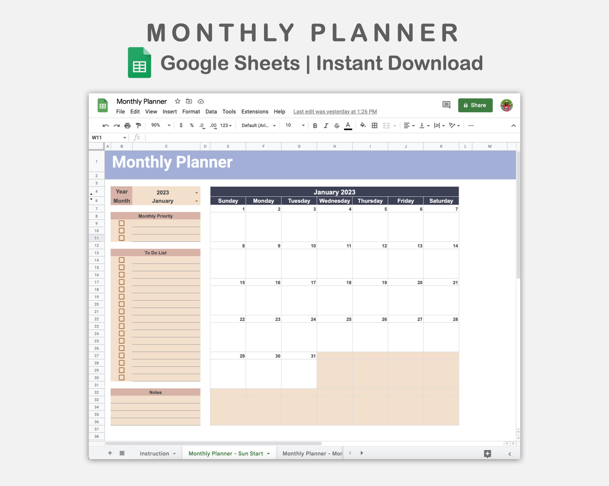 This Monthly Planner Spreadsheet for Google Sheets is made in SWEET theme in order to help you plan, organize, and keep track of important dates and events. It is available both Sunday Start and Monday Start.