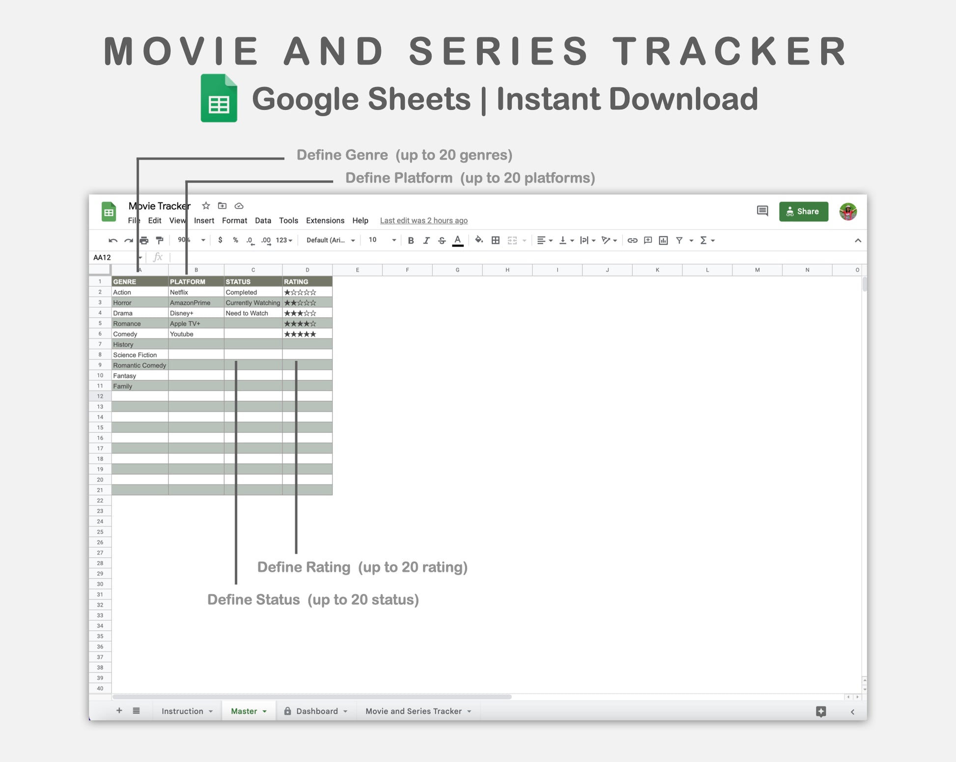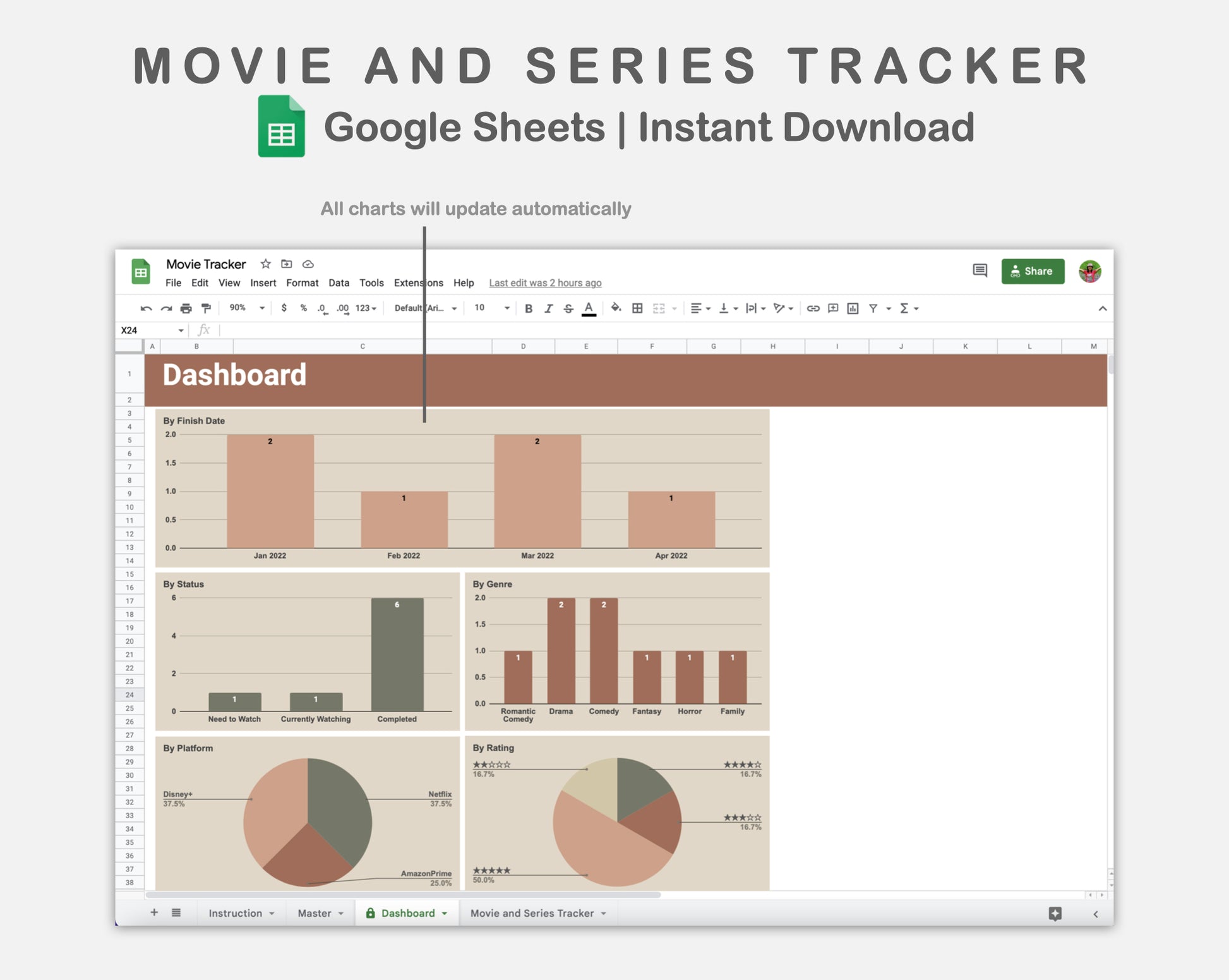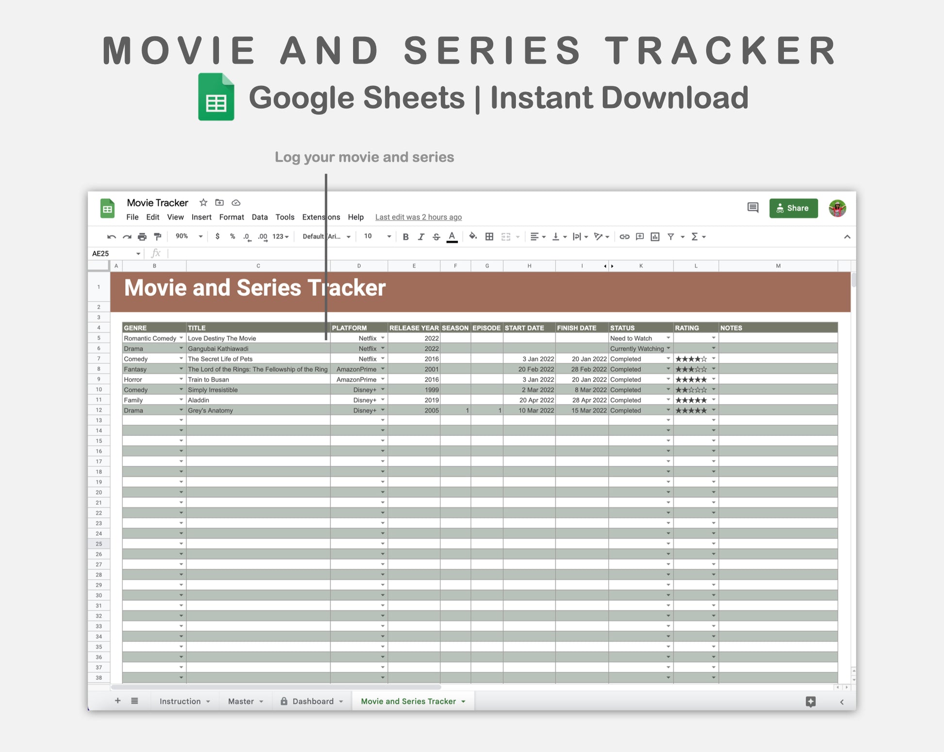 This Movie and Series Tracker for Google Sheets is made in EARTHY theme in order to help you keep track of your movie and series.