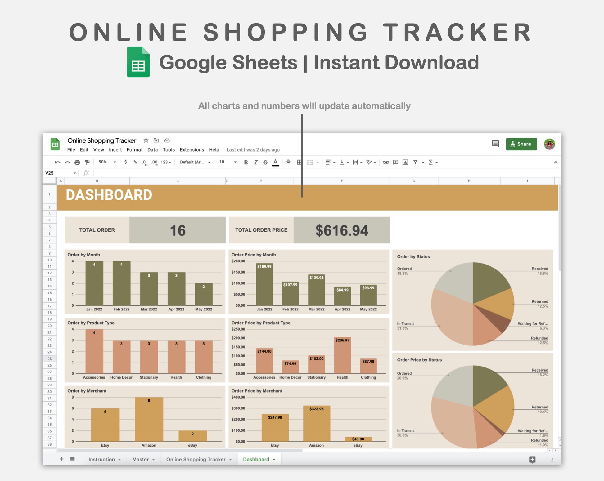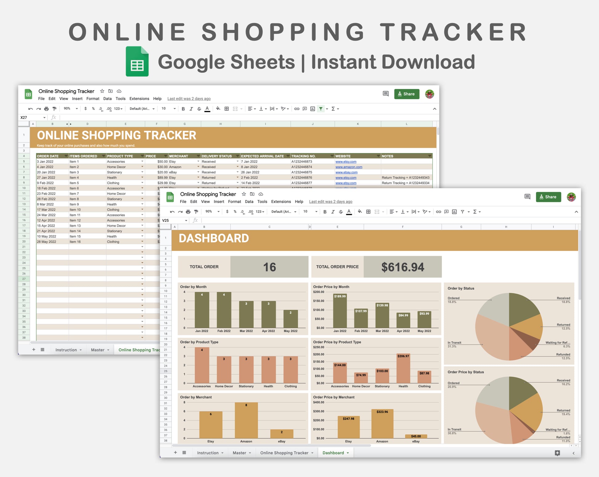 This Online Shopping Tracker for Google Sheets is made in BOHO theme in order to help you keep track of your online purchases and also how much you spend.