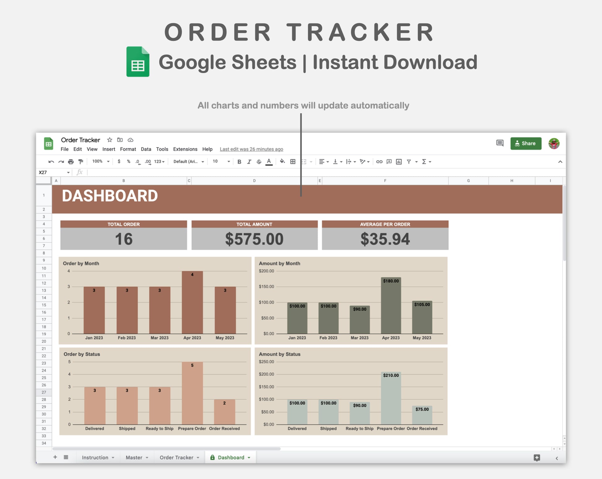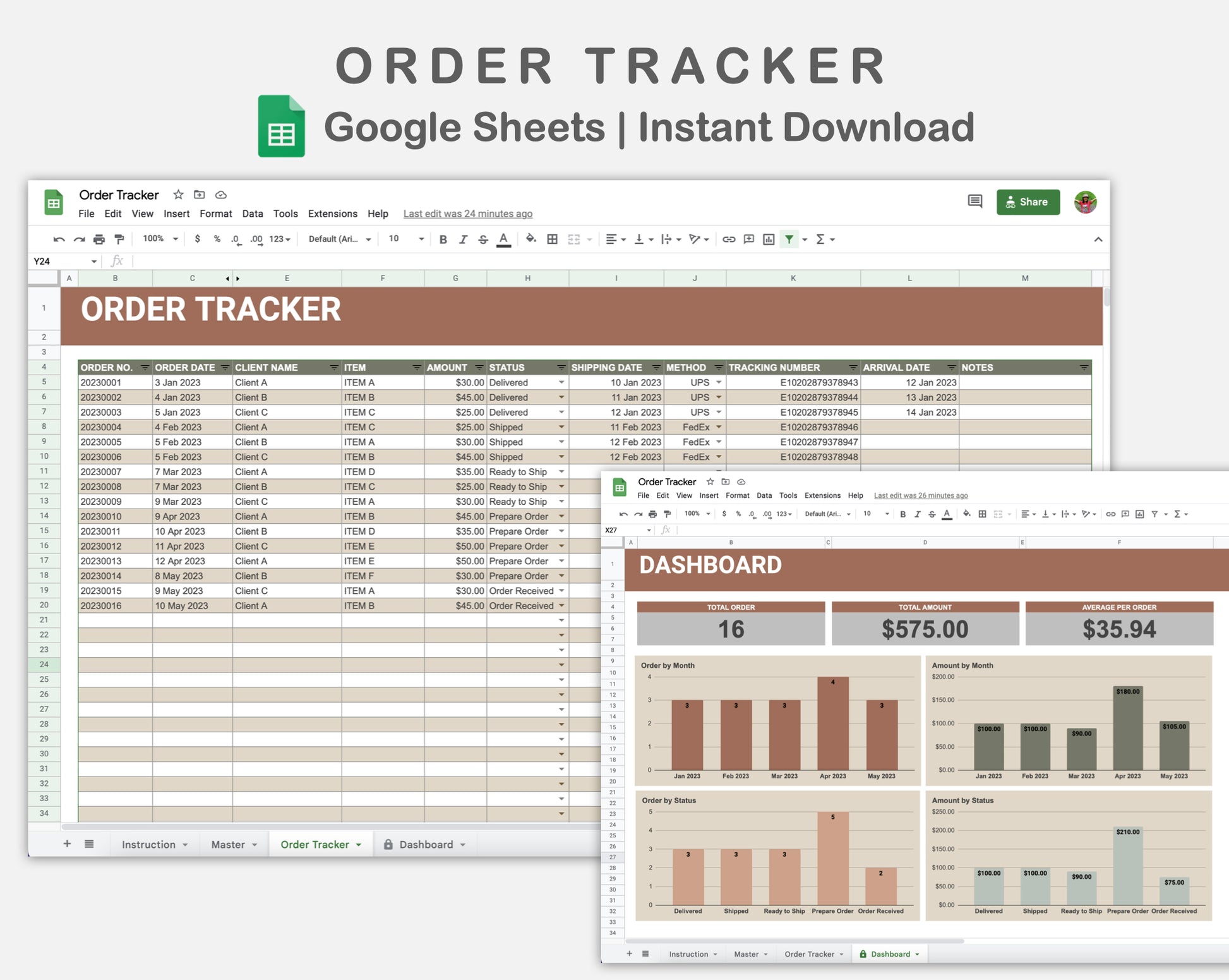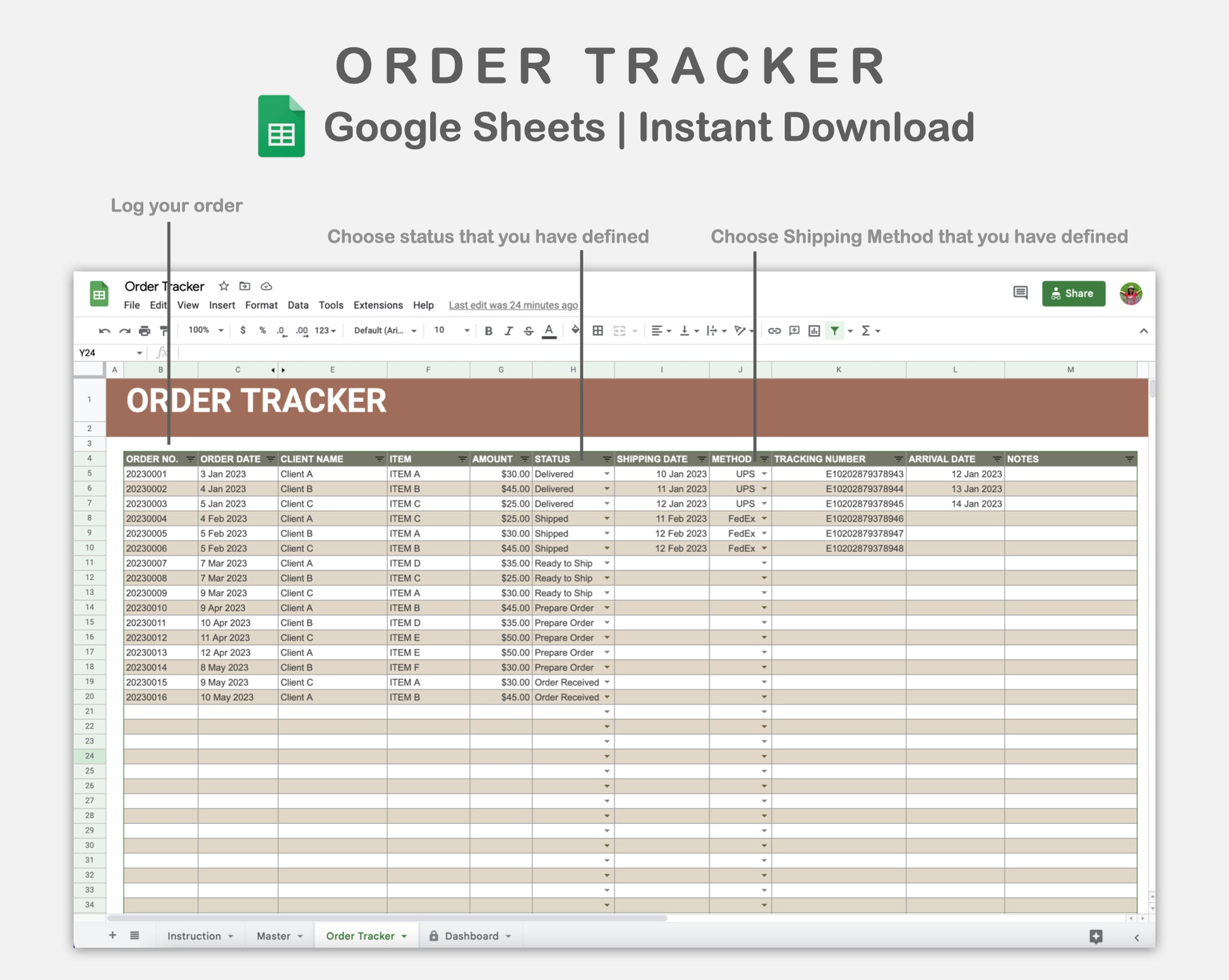 This Order Tracker for Google Sheets is made in EARTHY theme in order to help you track of orders, shipment status, and received amount.
