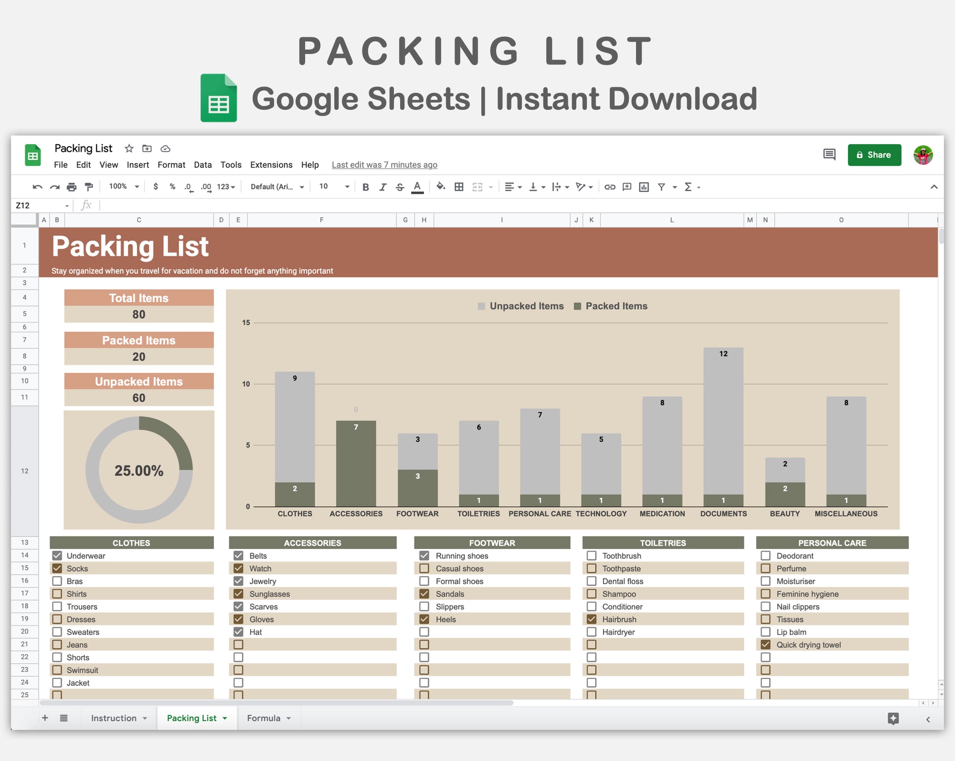 This Packing List Spreadsheet for Google Sheets is made in EARTHY theme in order to help you not forget your important items on your next trip.