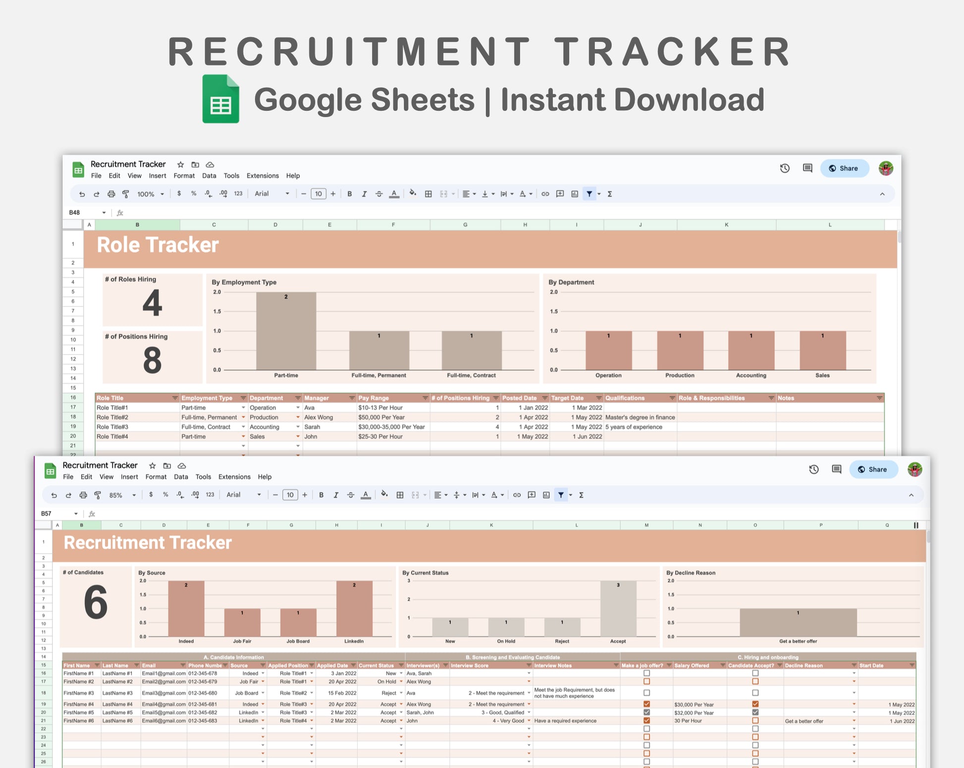 This Recruitment Tracker Spreadsheet for Google Sheets is made in NEUTRAL theme in order to help you keep track of hiring roles and also candidates.
