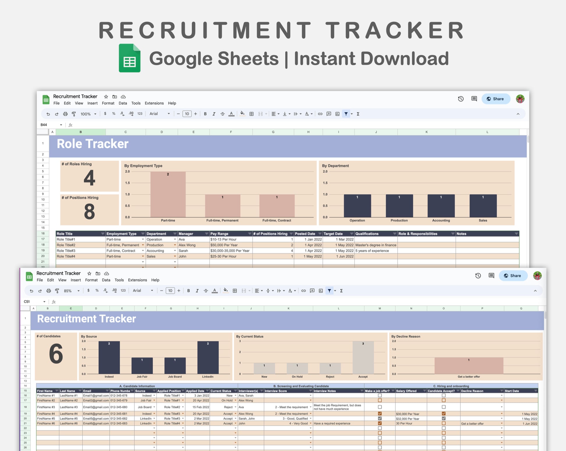 This Recruitment Tracker Spreadsheet for Google Sheets is made in SWEET theme in order to help you keep track of hiring roles and also candidates.