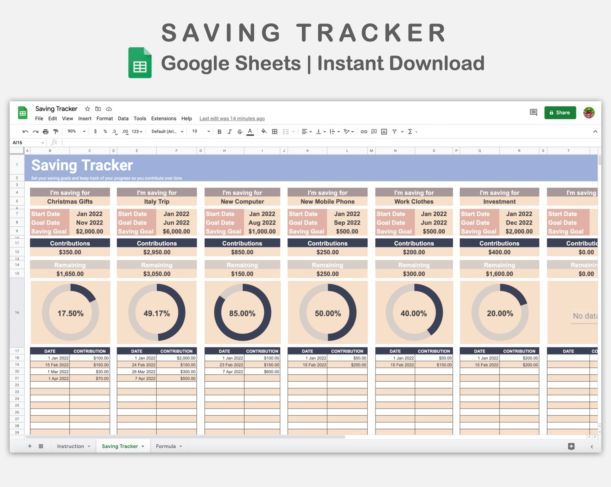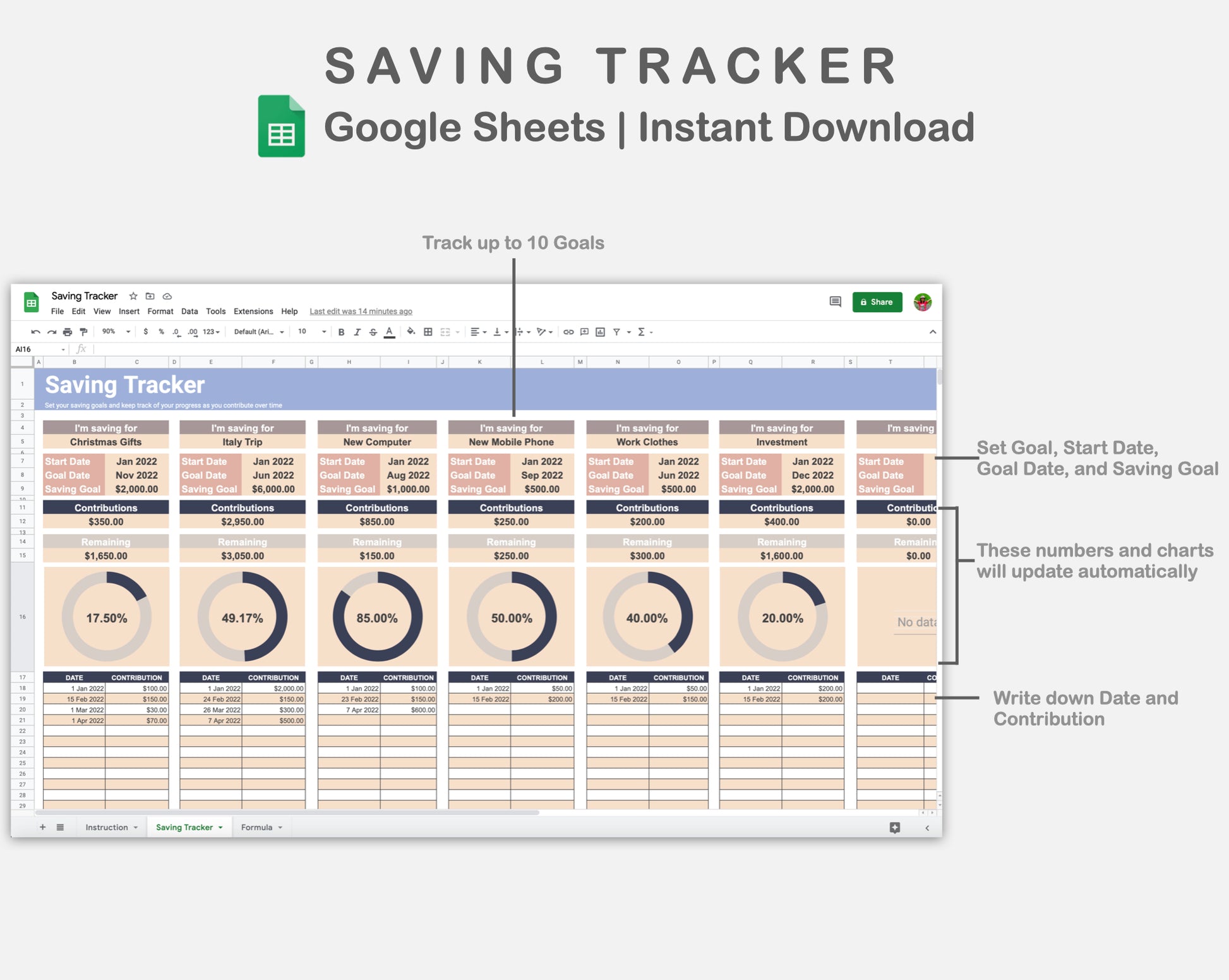 This Savings Tracker Spreadsheet for Google Sheets is made in SWEET theme in order to help you keep track of your savings goal.