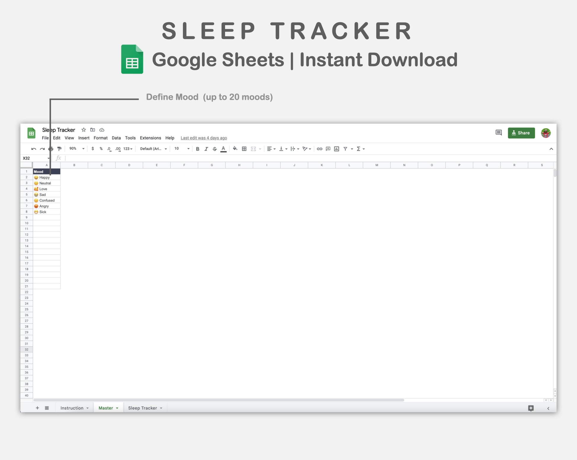 This Sleep Tracker Spreadsheet for Google Sheets is made in SWEET theme in order to help you track your sleep daily and maintain your sleep schedule.