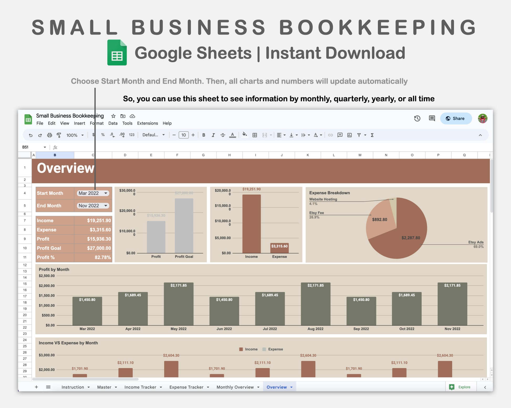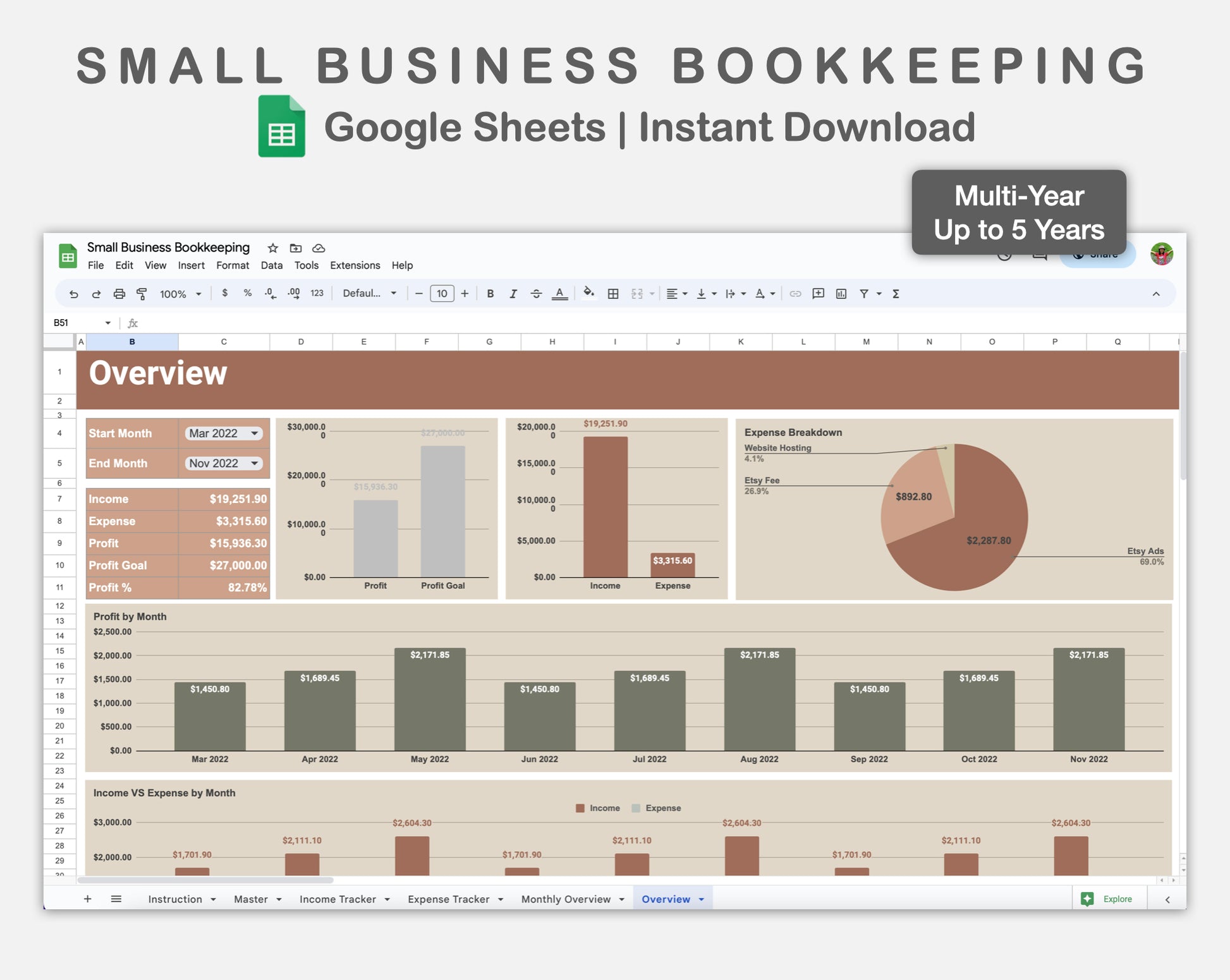 This Small Business Bookkeeping for Google Sheets is made in EARTHY theme in order to help you track your business incomes, expenses and also profits for multi-year (up to 5 years).