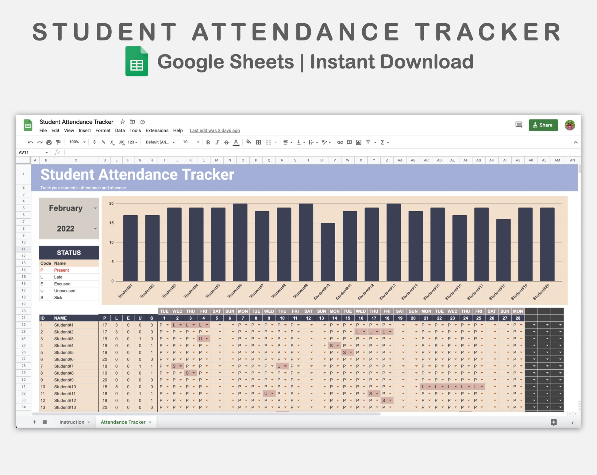 This Student Attendance Tracker Spreadsheet for Google Sheets is made in SWEET theme in order to help you keep track of your students' attendance and absences.