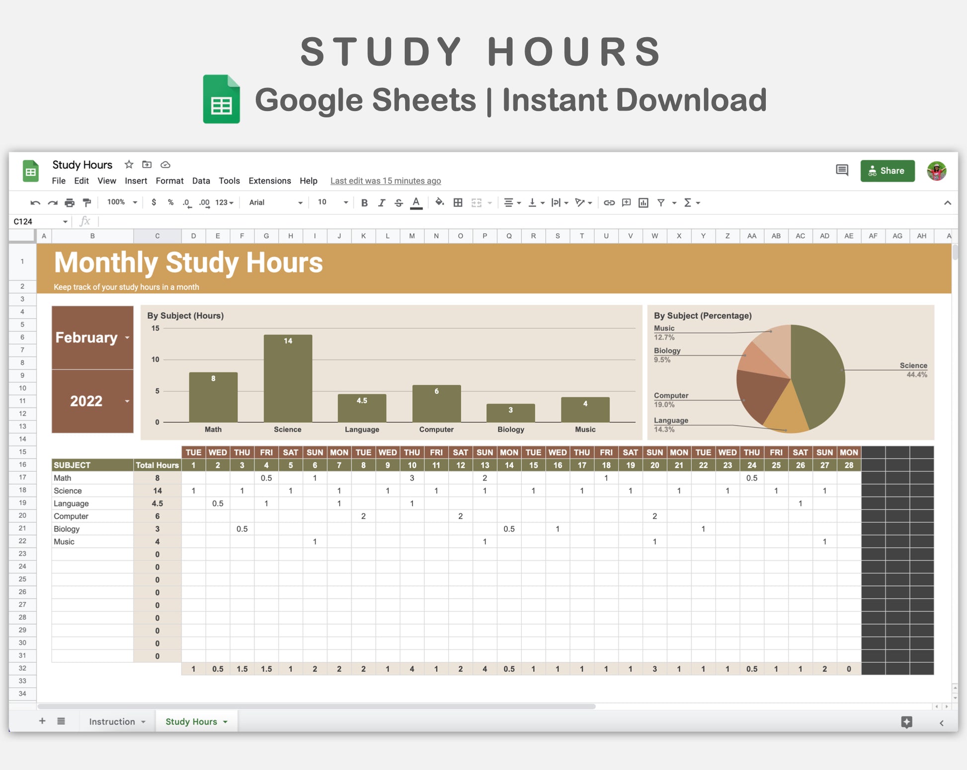 This Study Hours Spreadsheet for Google Sheets is made in BOHO theme in order to help you keep track of your study hours in a month.