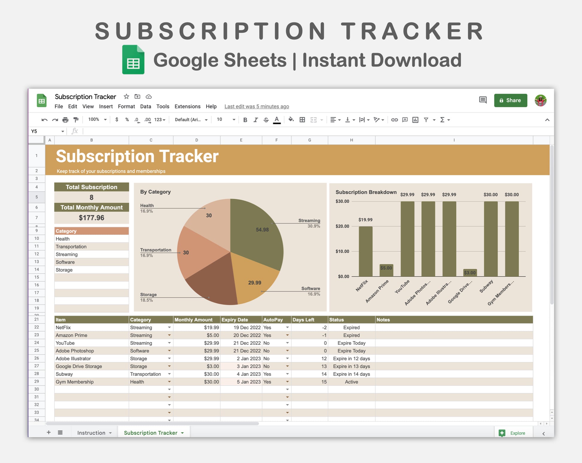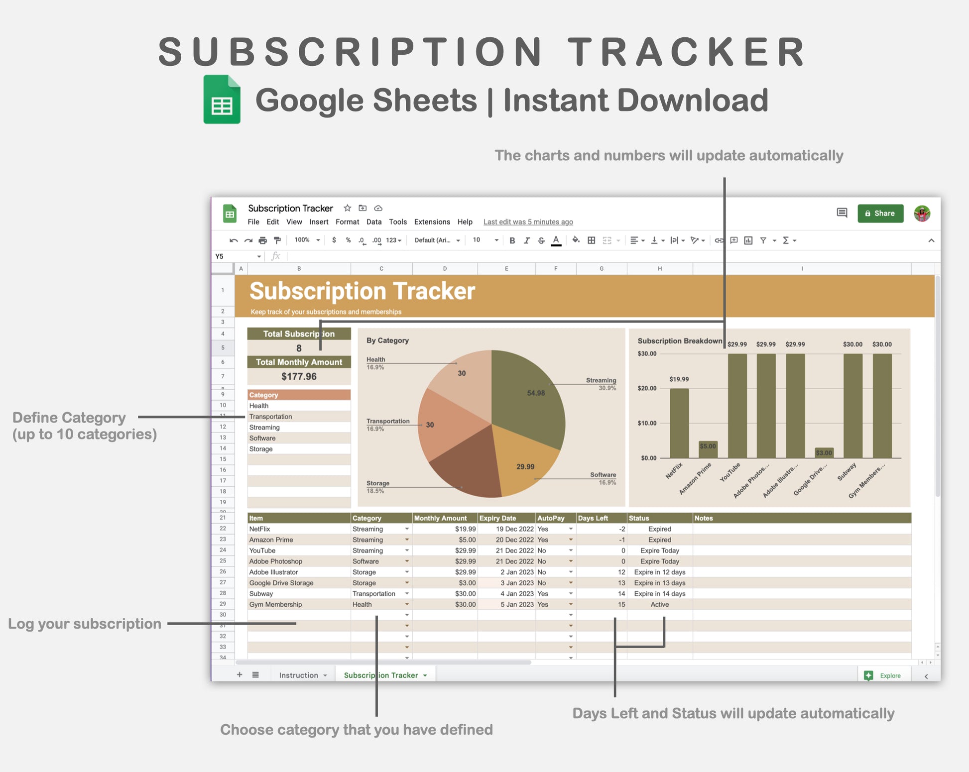 Google Sheets - Subscription Tracker - Boho