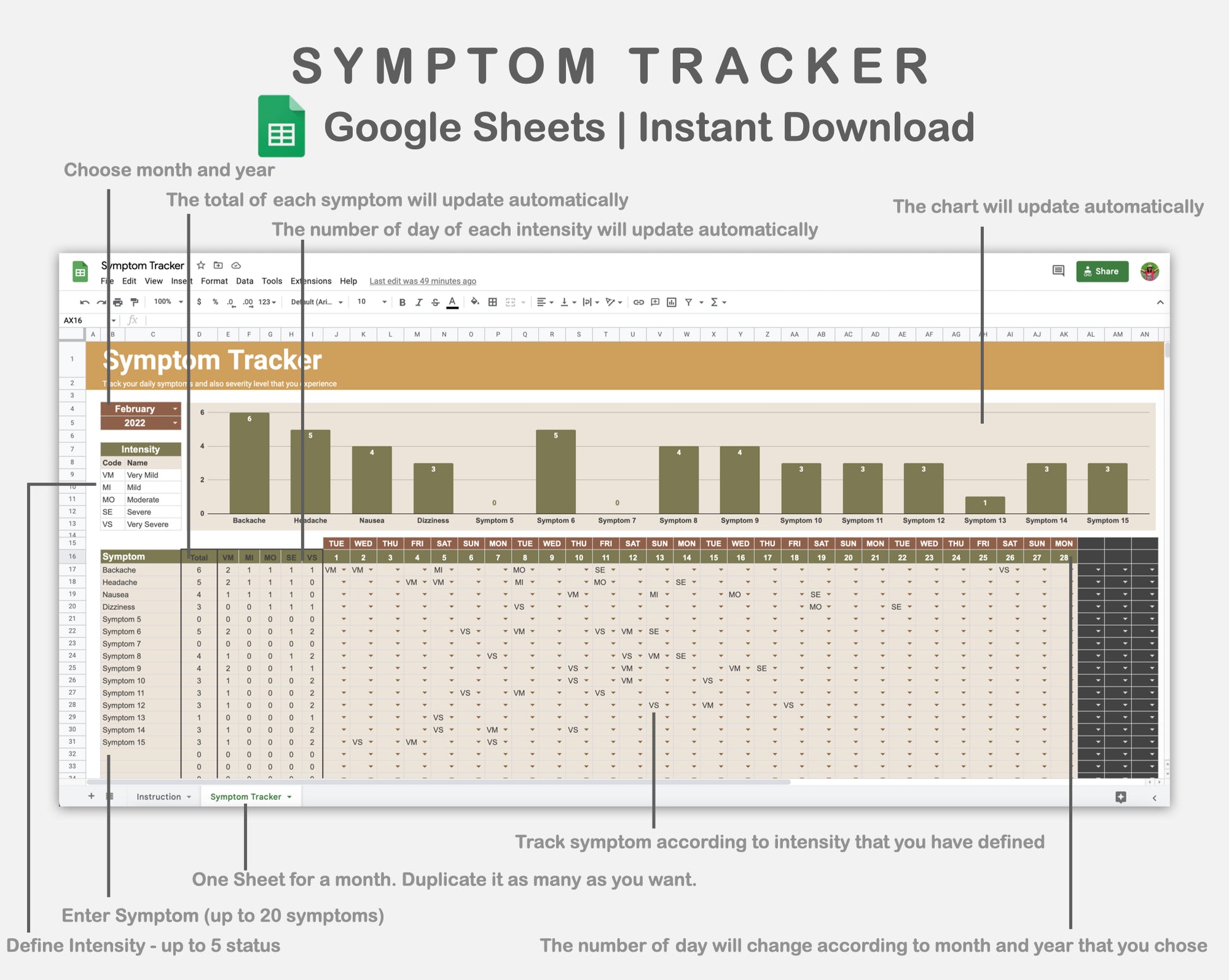 This Symptom Tracker Spreadsheet for Google Sheets is made in BOHO theme in order to help you track your daily symptoms and also severity level that you experience.