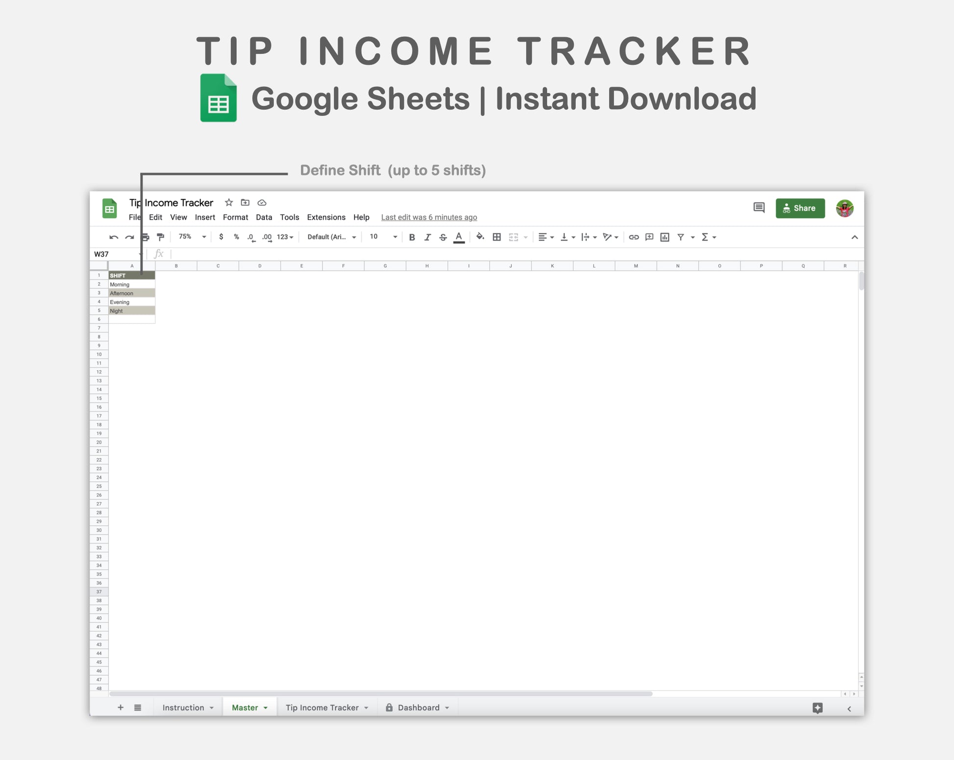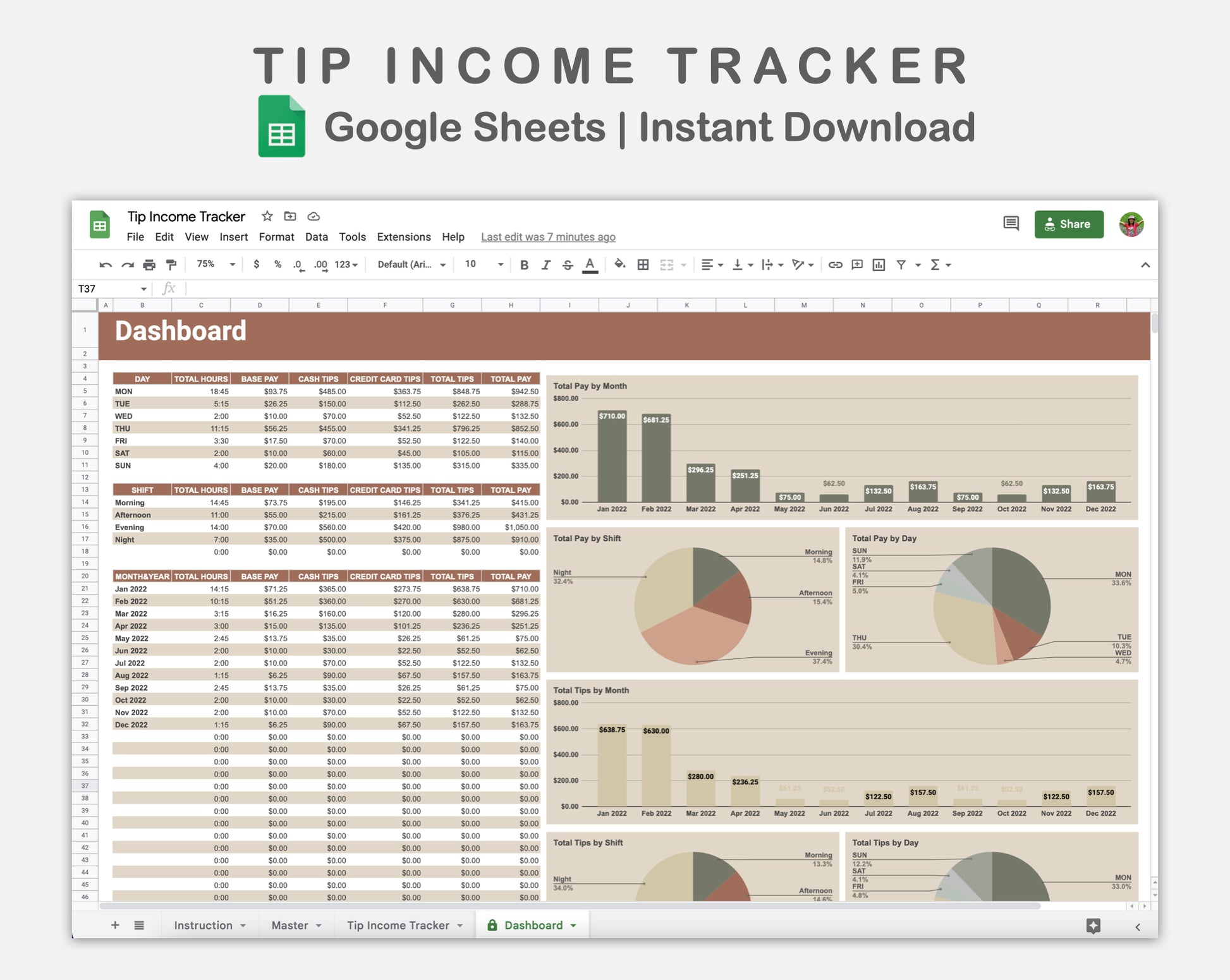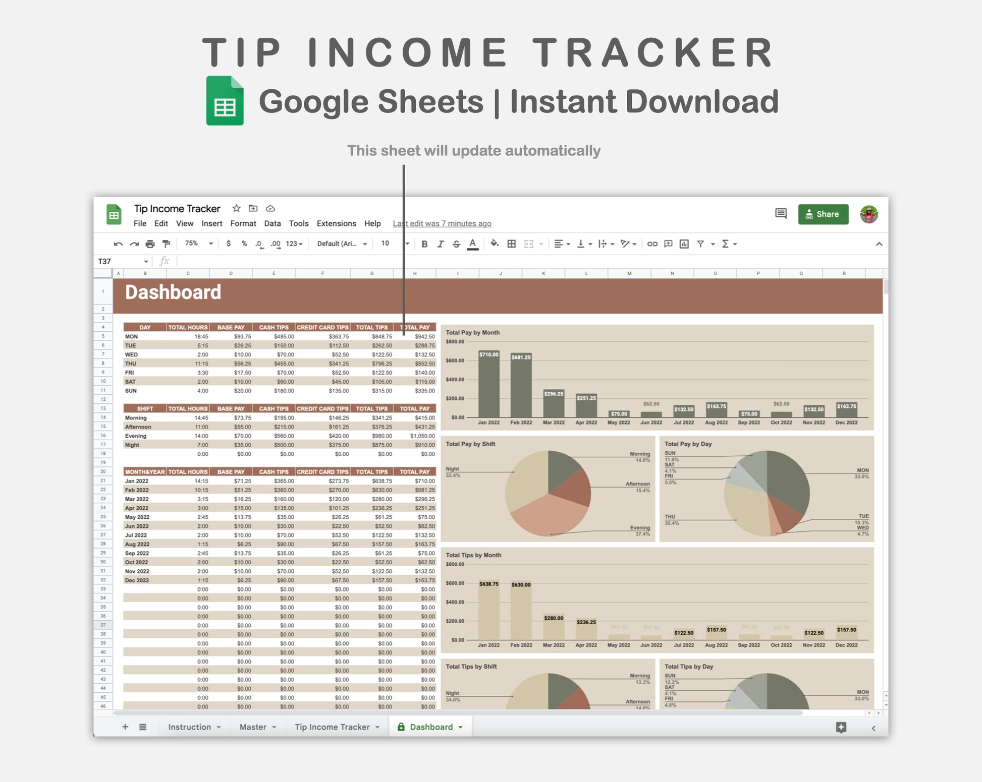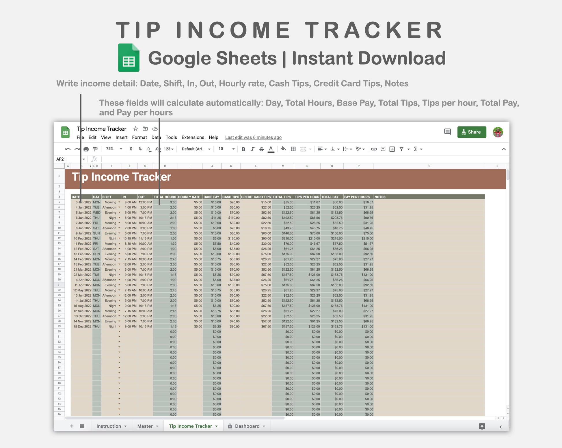 This Tip Income Tracker Spreadsheet for Google Sheets is made in EARTHY theme in order to help you easily track your hours worked, hourly income, and tips.