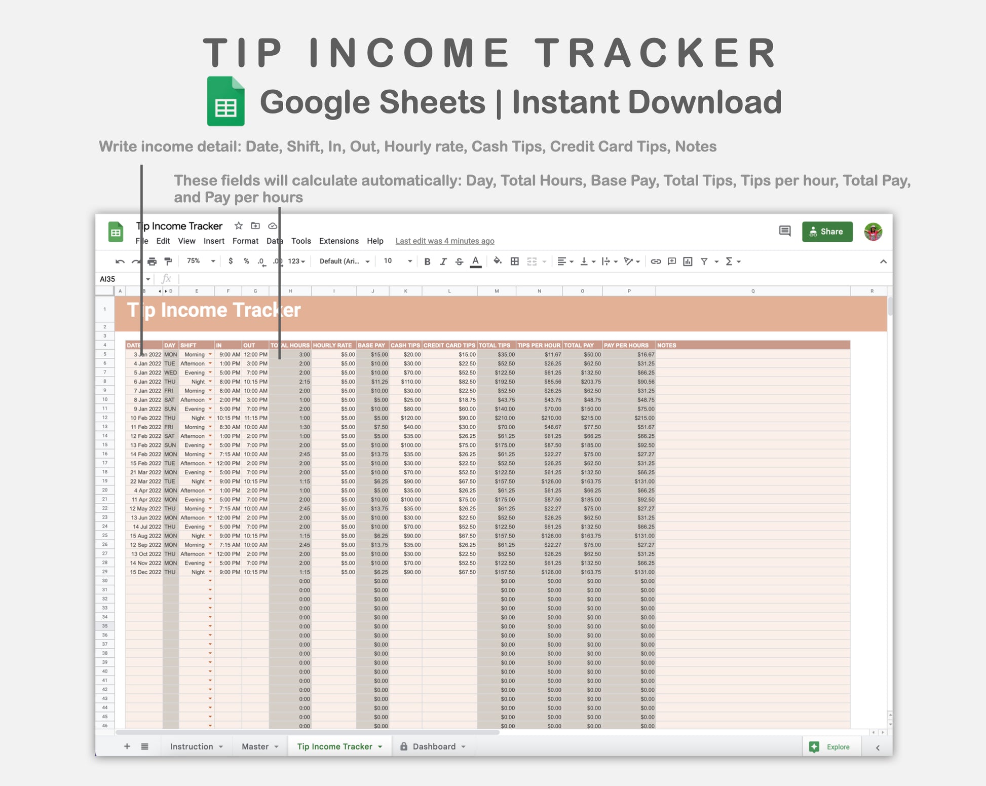 Google Sheets - Tip Income Tracker - Neutral