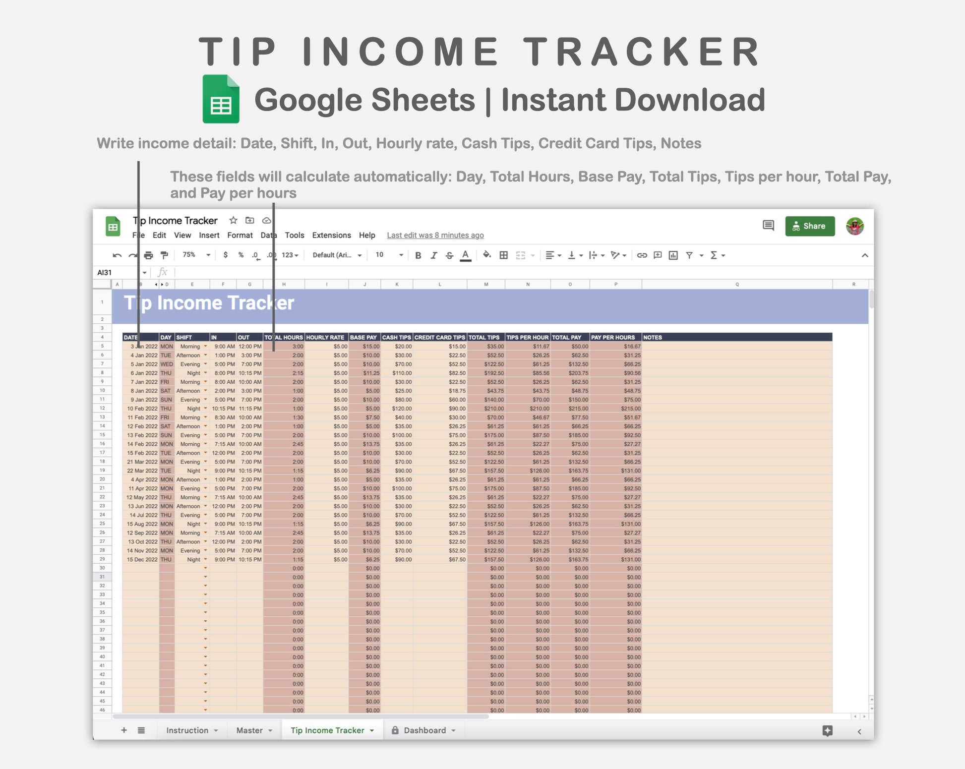 Google Sheets - Tip Income Tracker - Sweet