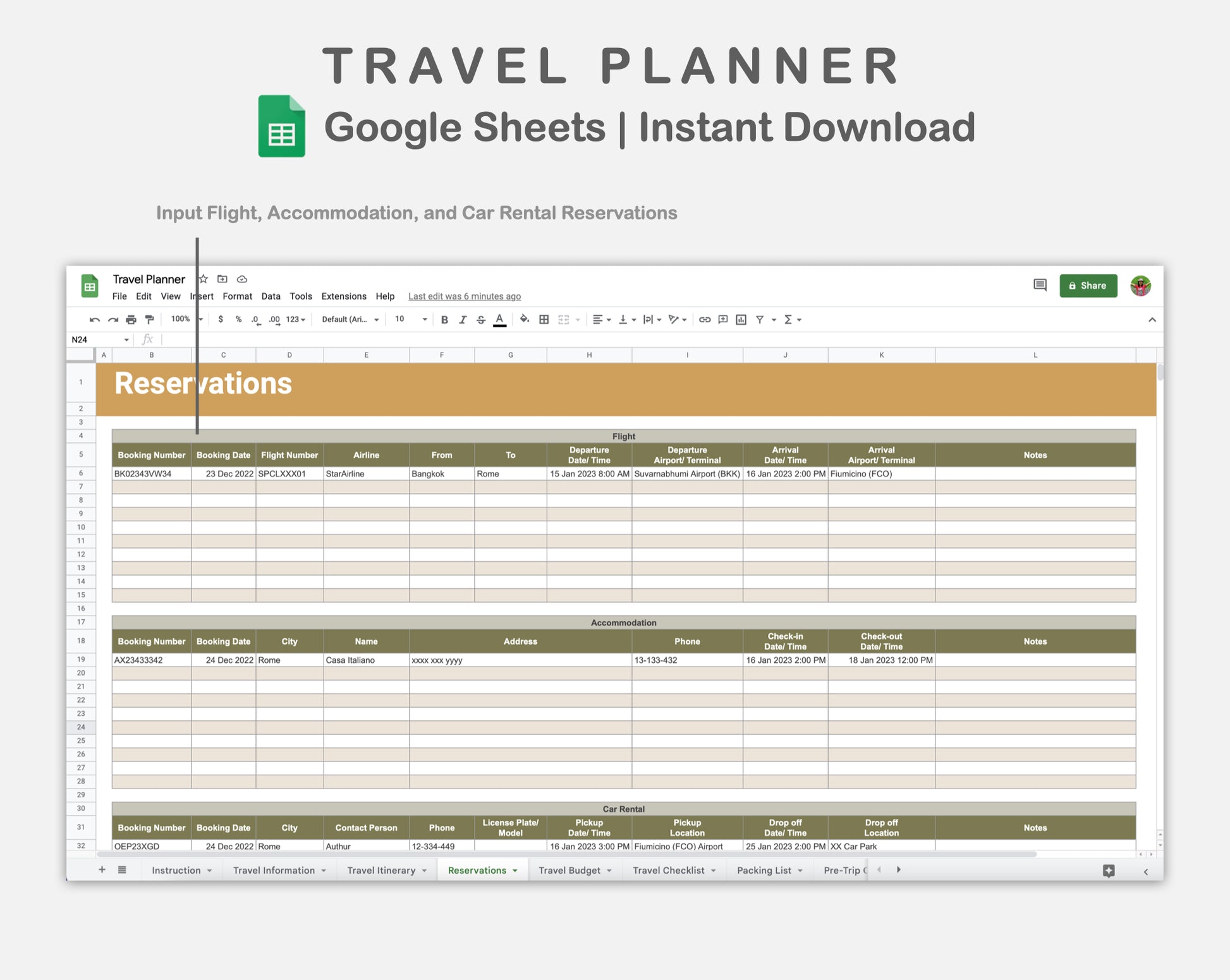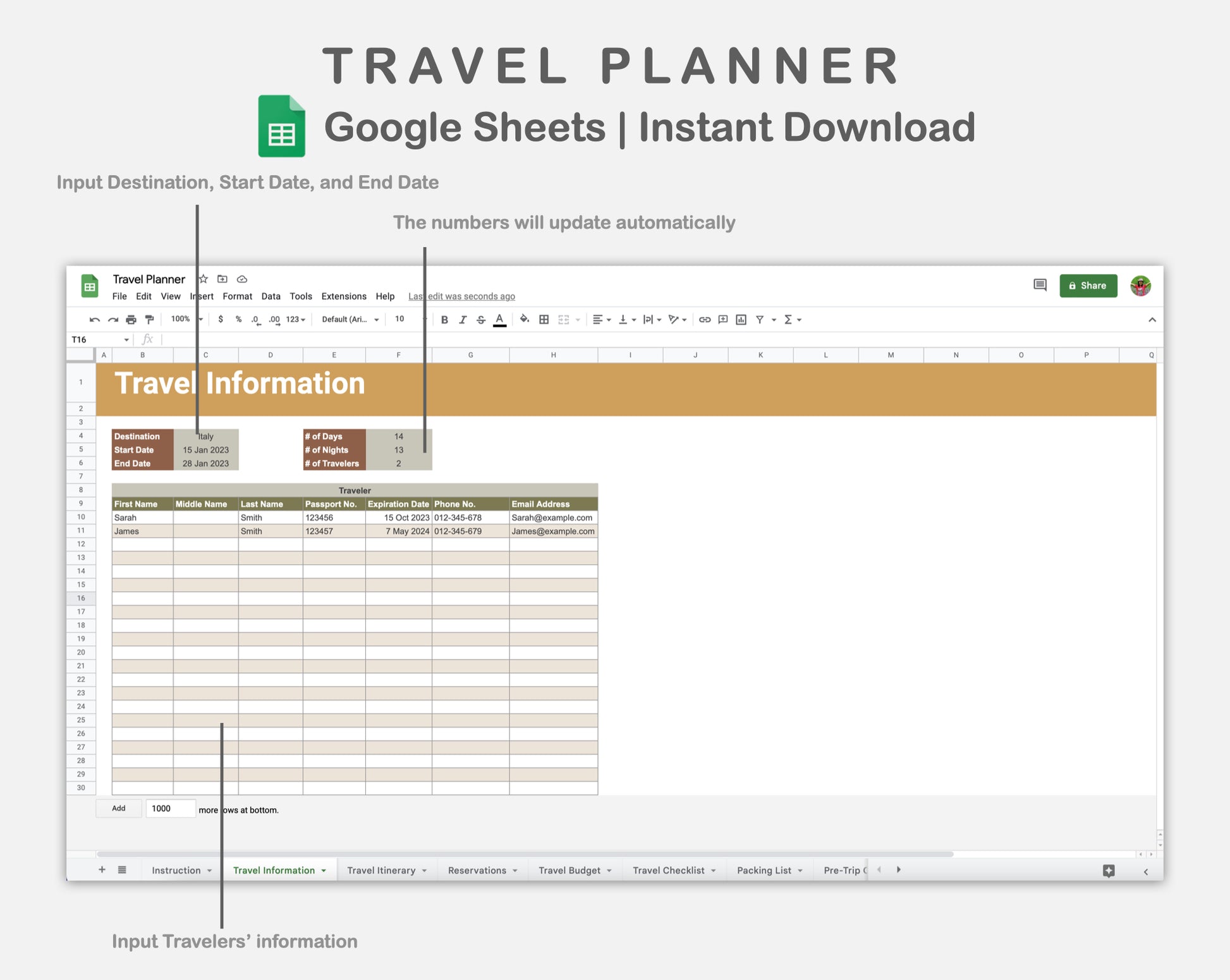 • There are 9 sheets: Instruction, Travel Information, Travel Itinerary, Reservations, Travel Budget, Travel Checklist, Packing List, Pre-Trip Checklist, and Travel Insurance.