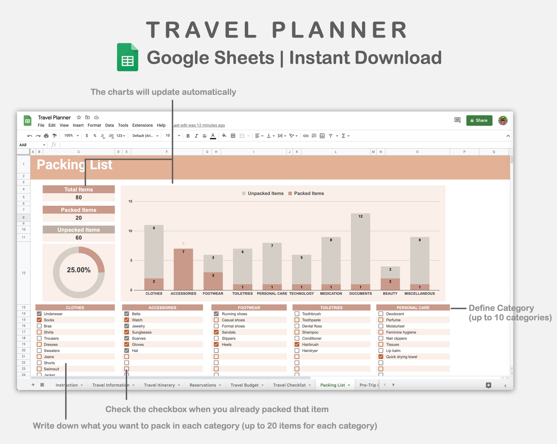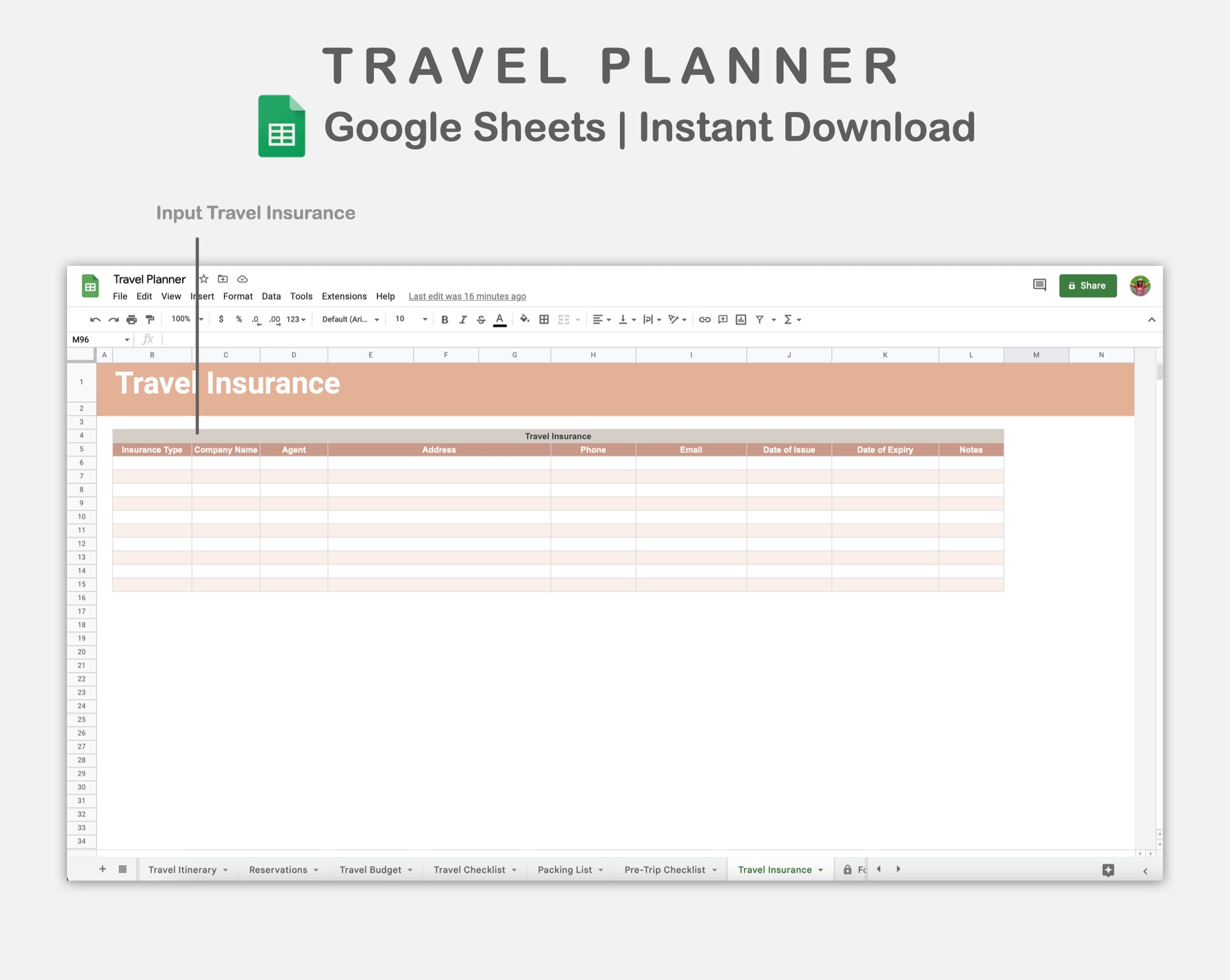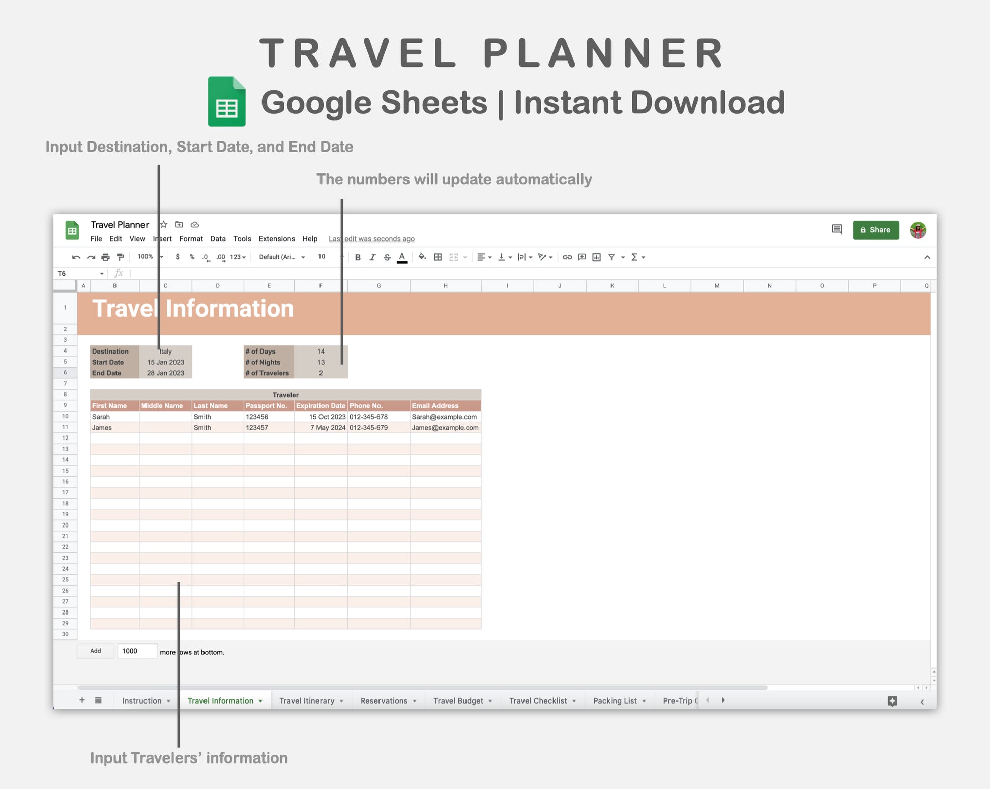 • There are 9 sheets: Instruction, Travel Information, Travel Itinerary, Reservations, Travel Budget, Travel Checklist, Packing List, Pre-Trip Checklist, and Travel Insurance.