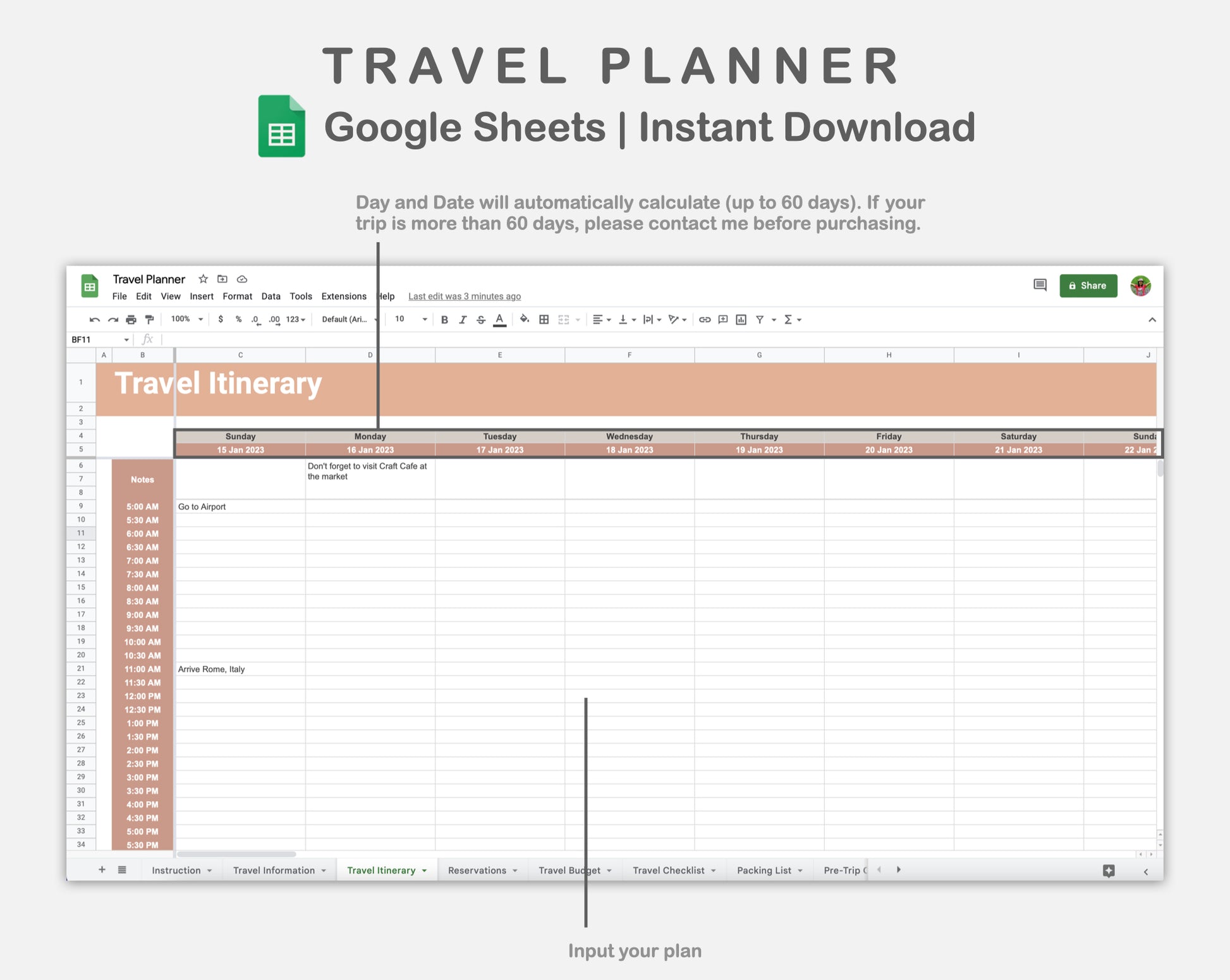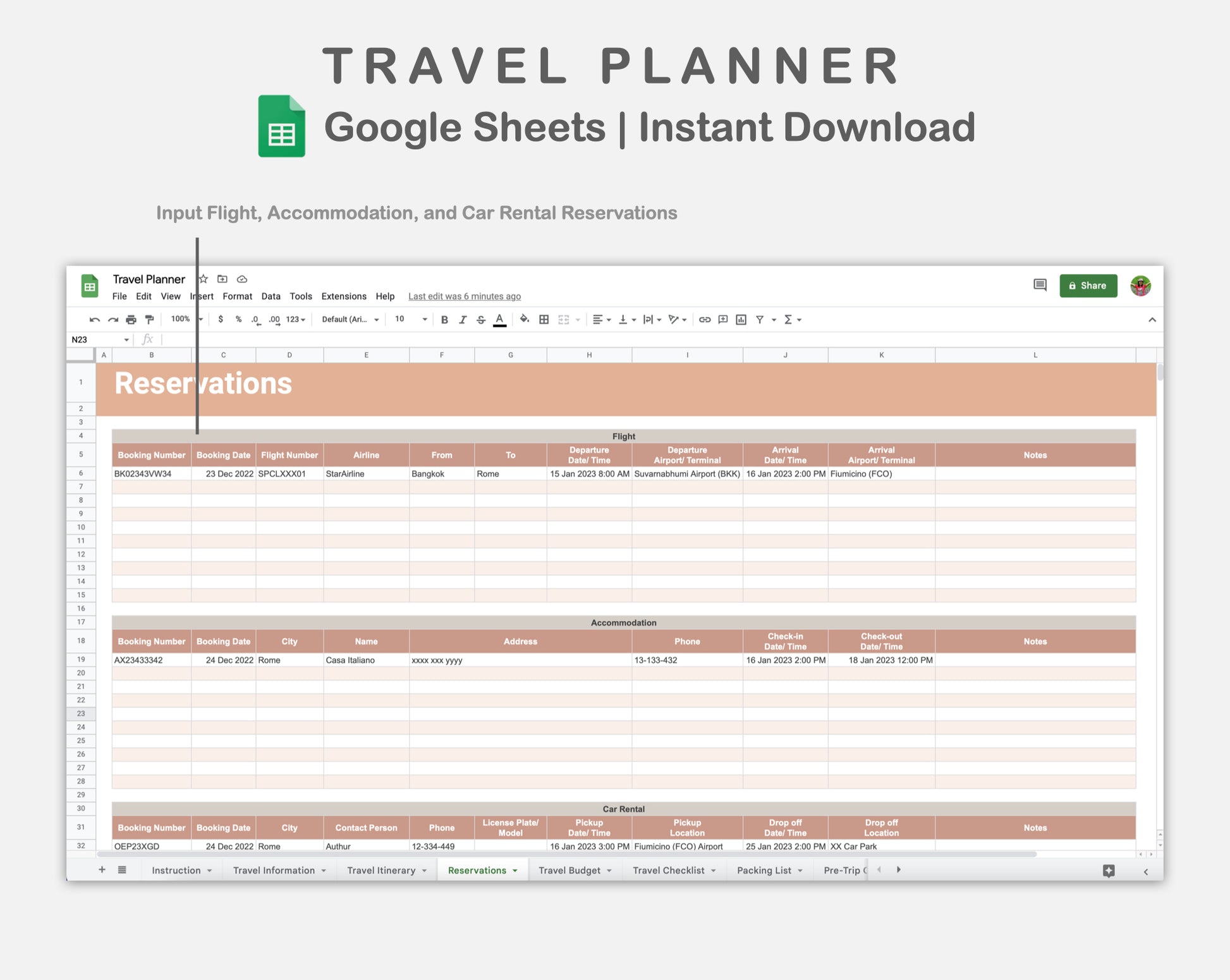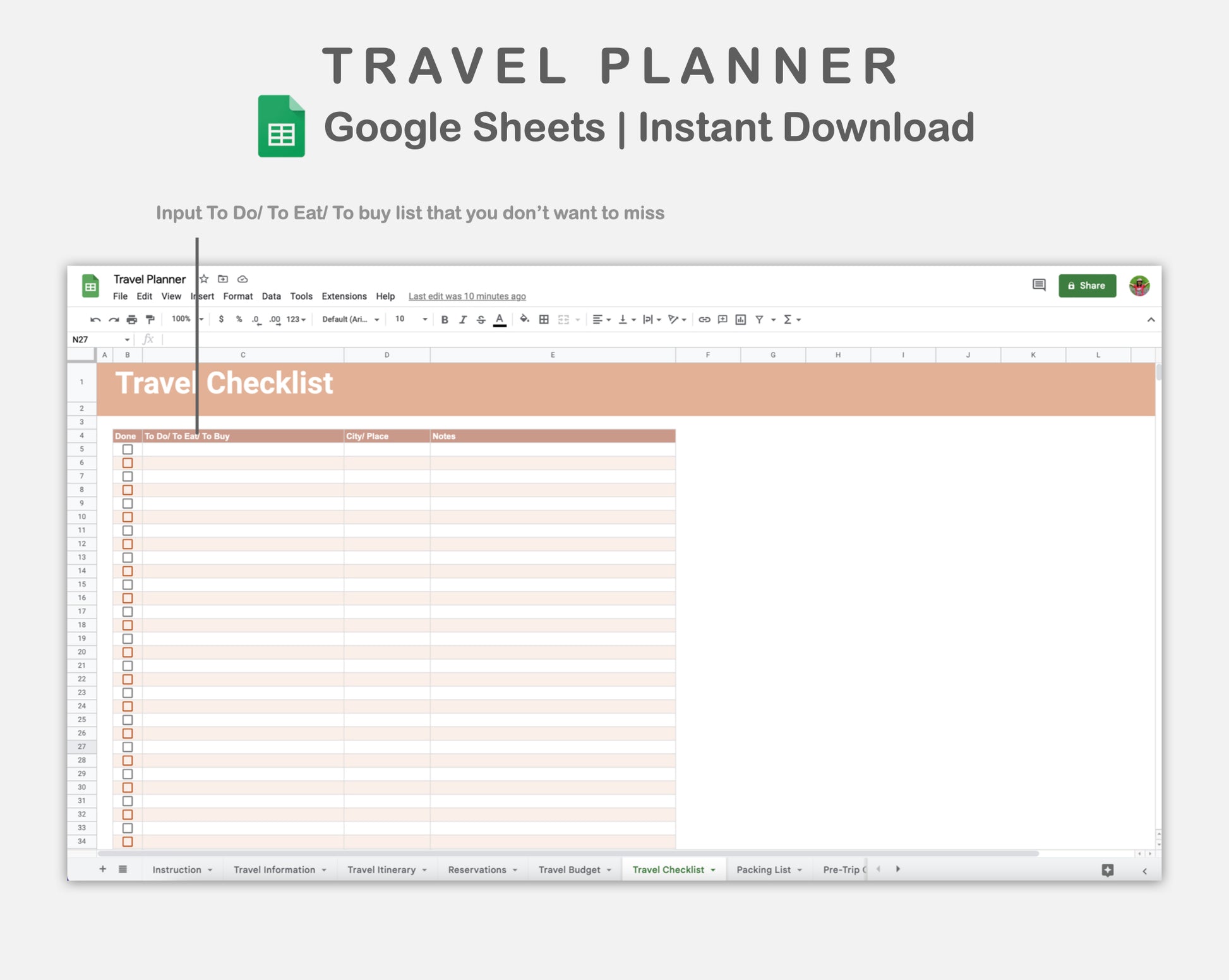 This Travel Planner Spreadsheet for Google Sheets is made in NEUTRAL theme in order to help you plan and organize your trip.