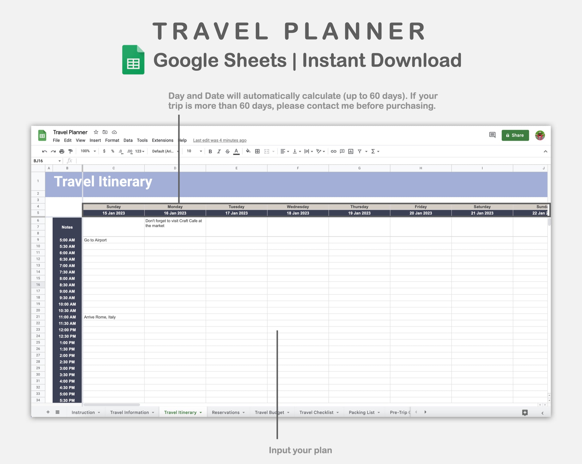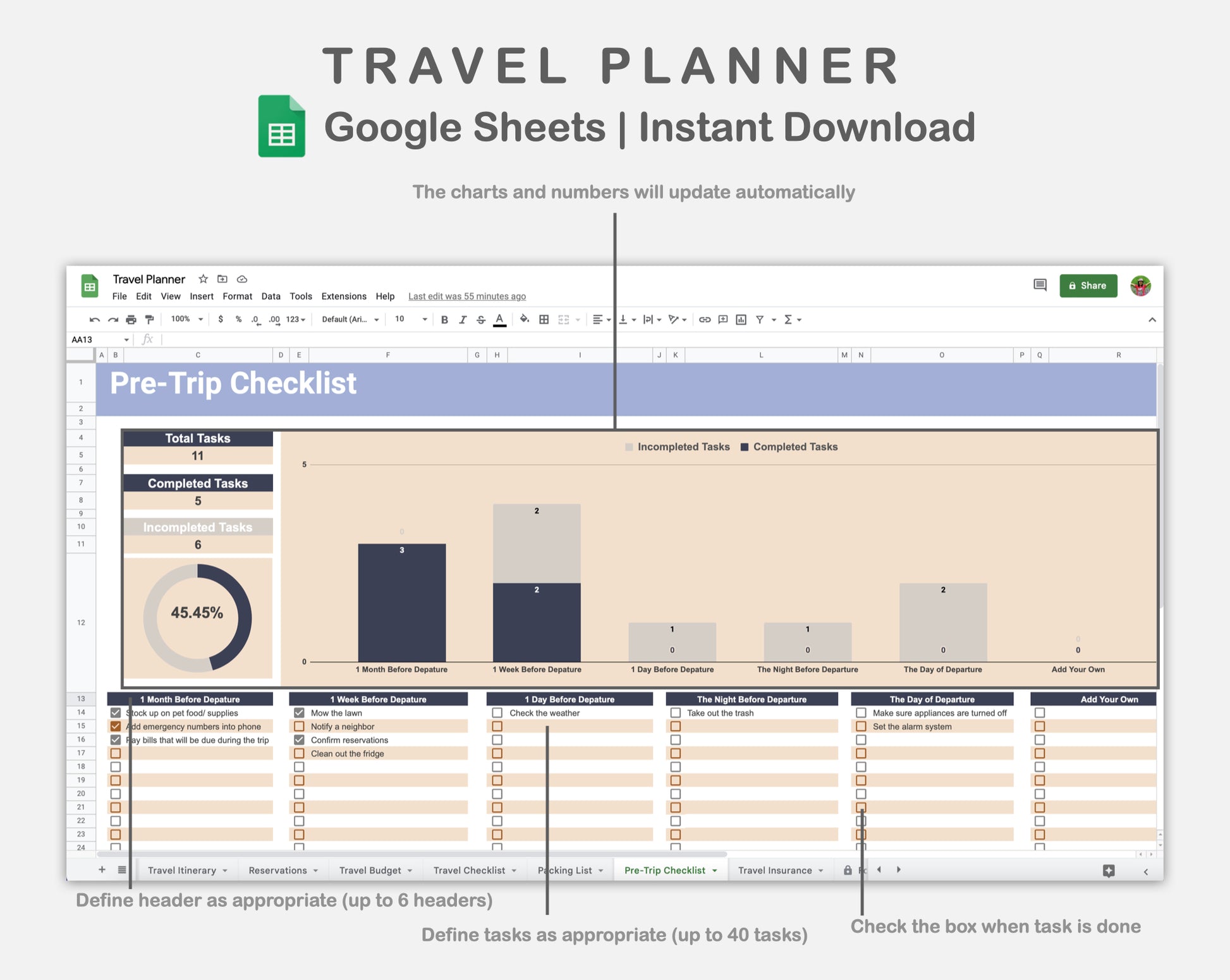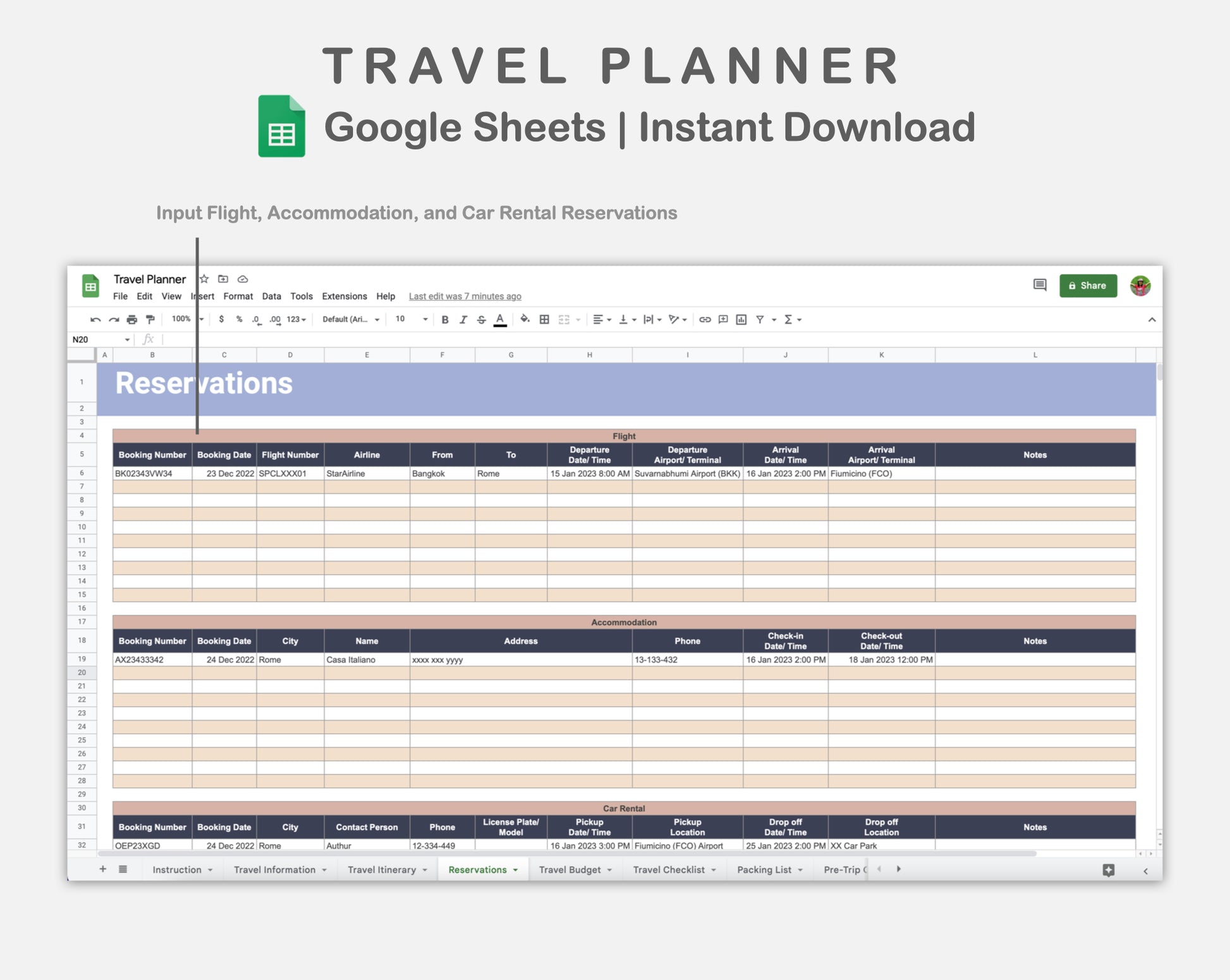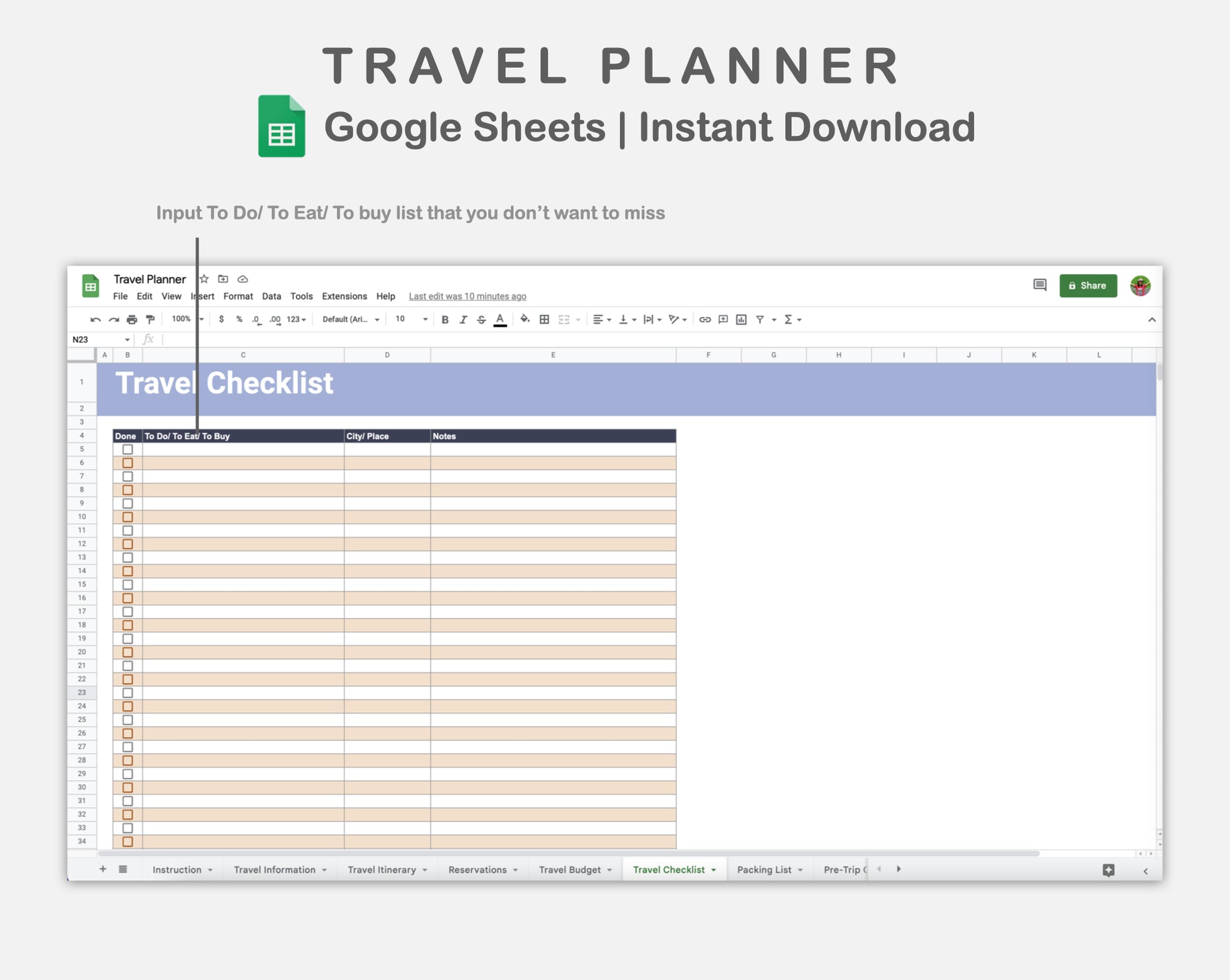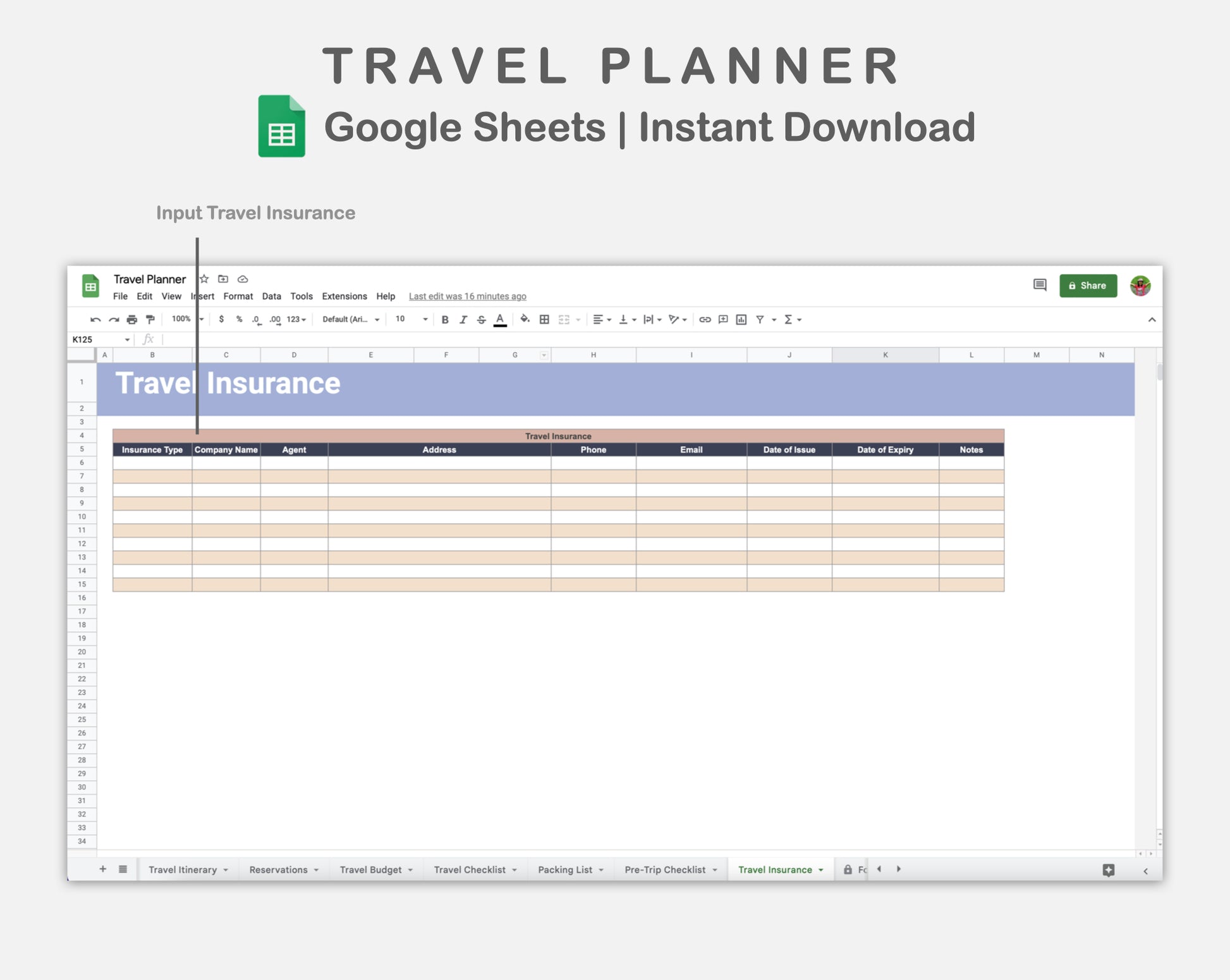 • There are 9 sheets: Instruction, Travel Information, Travel Itinerary, Reservations, Travel Budget, Travel Checklist, Packing List, Pre-Trip Checklist, and Travel Insurance.