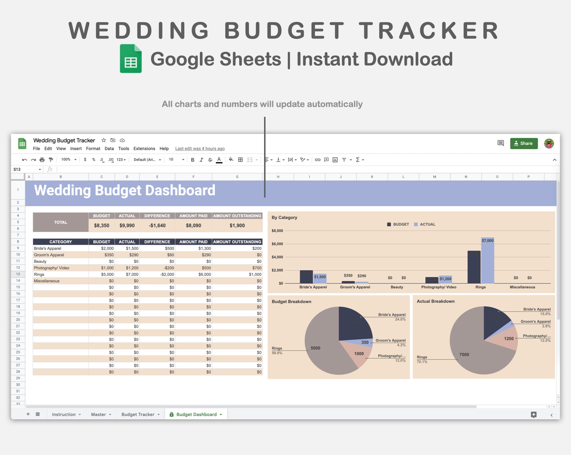 This Wedding Budget Tracker Spreadsheet for Google Sheets is made in SWEET theme in order to help you keep track of your wedding expenses.