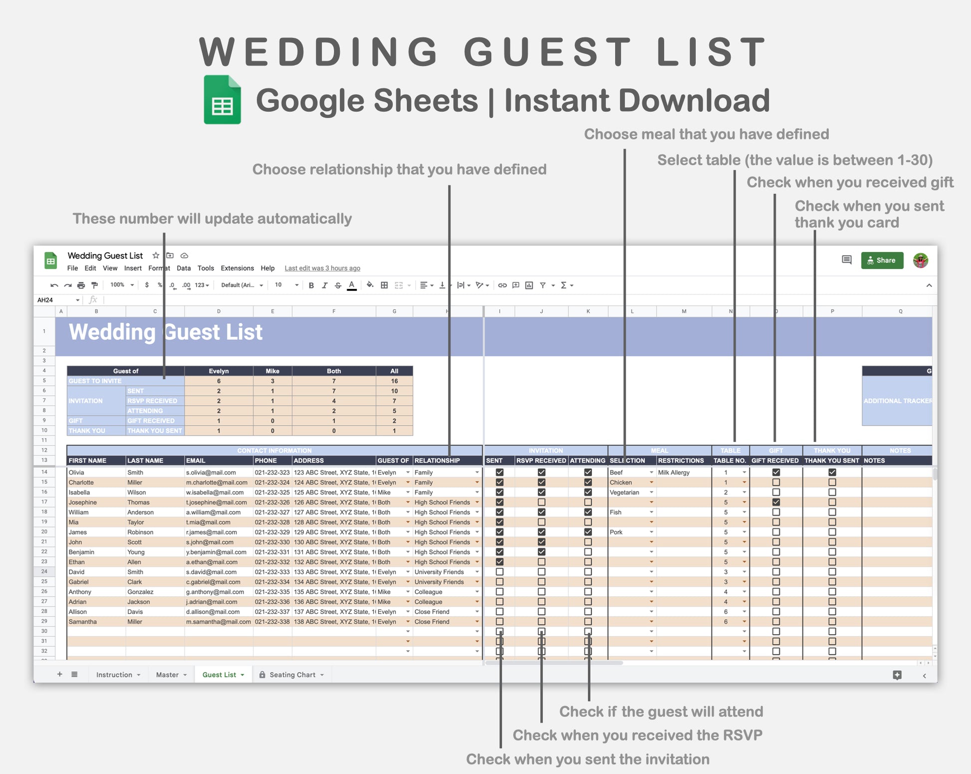 This Wedding Guest List Spreadsheet for Google Sheets is made in SWEET theme in order to help you plan your guest list and manage your seating tables.