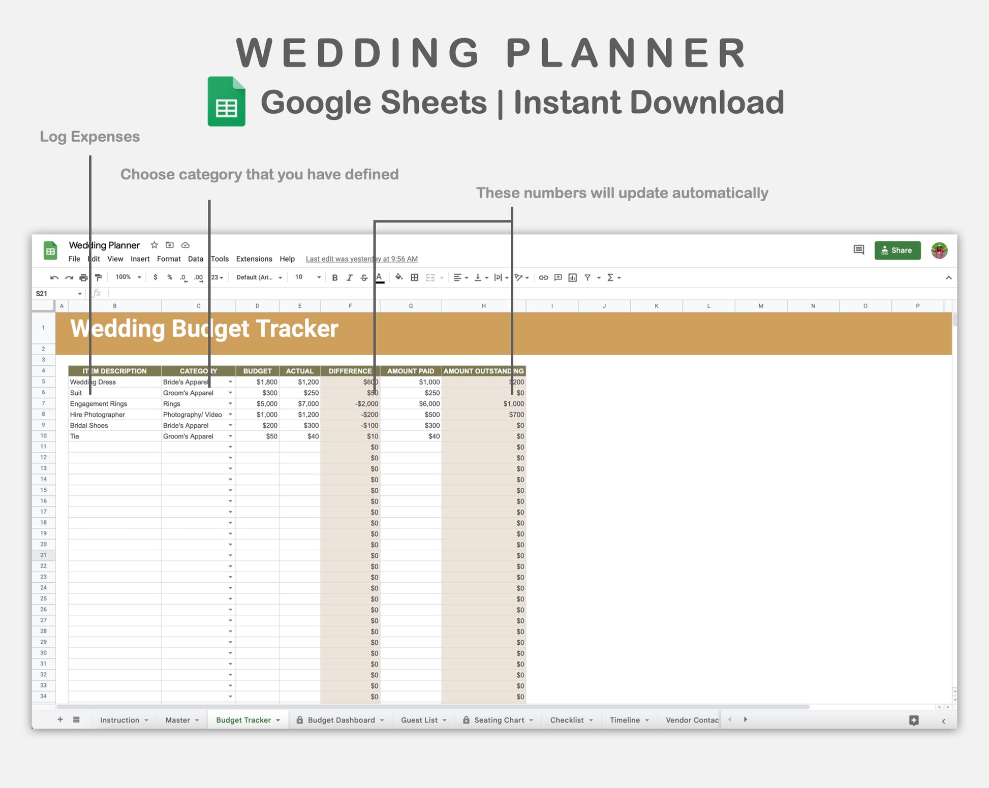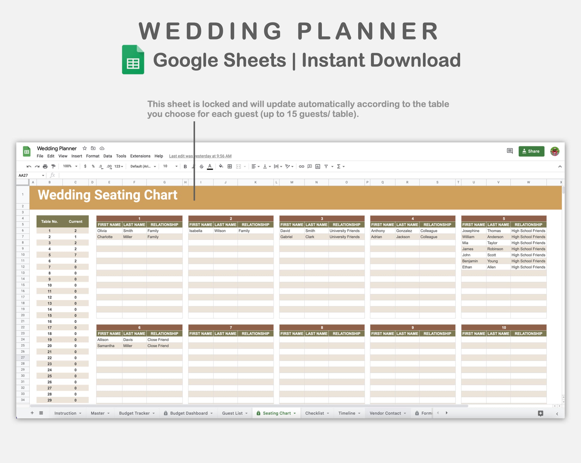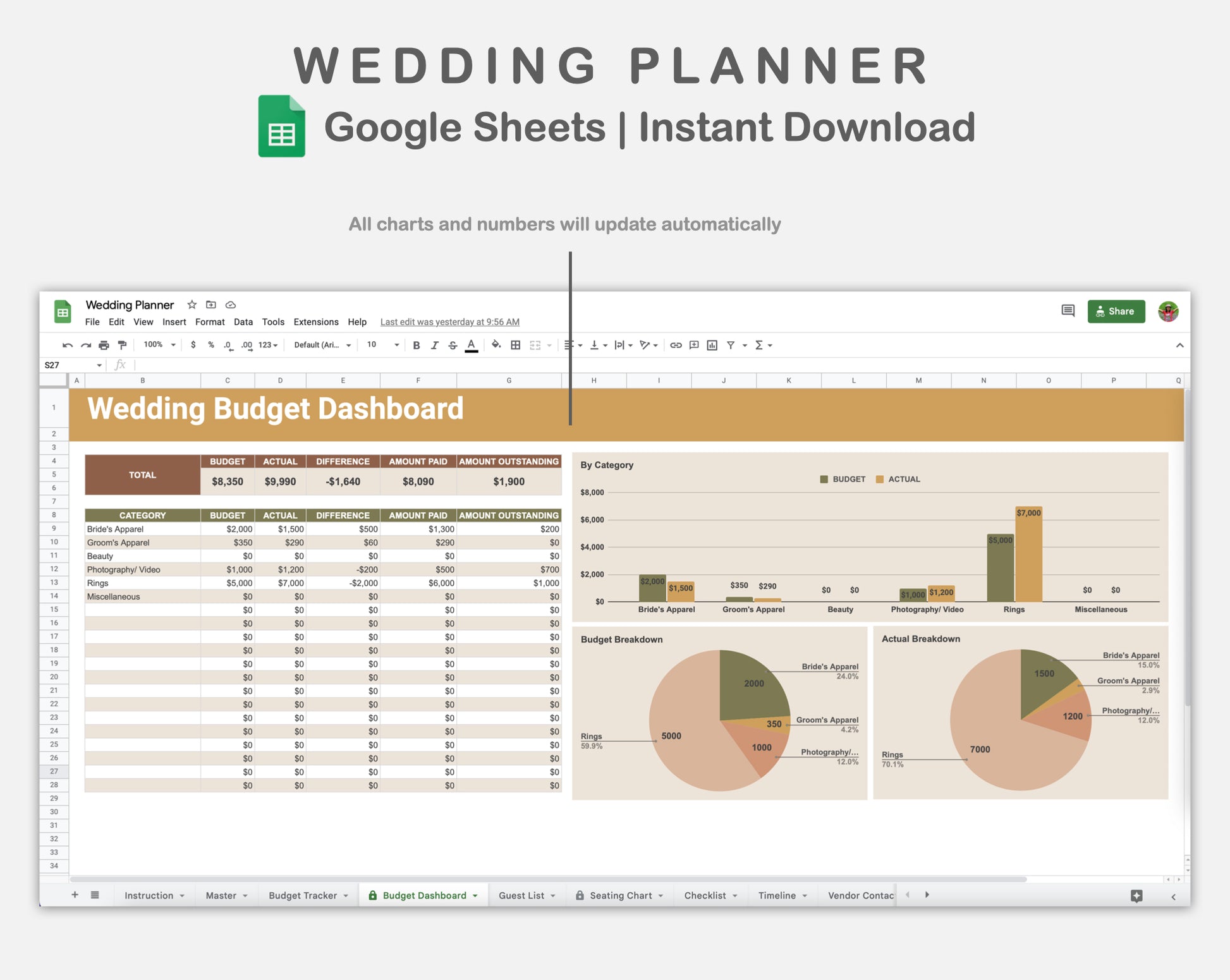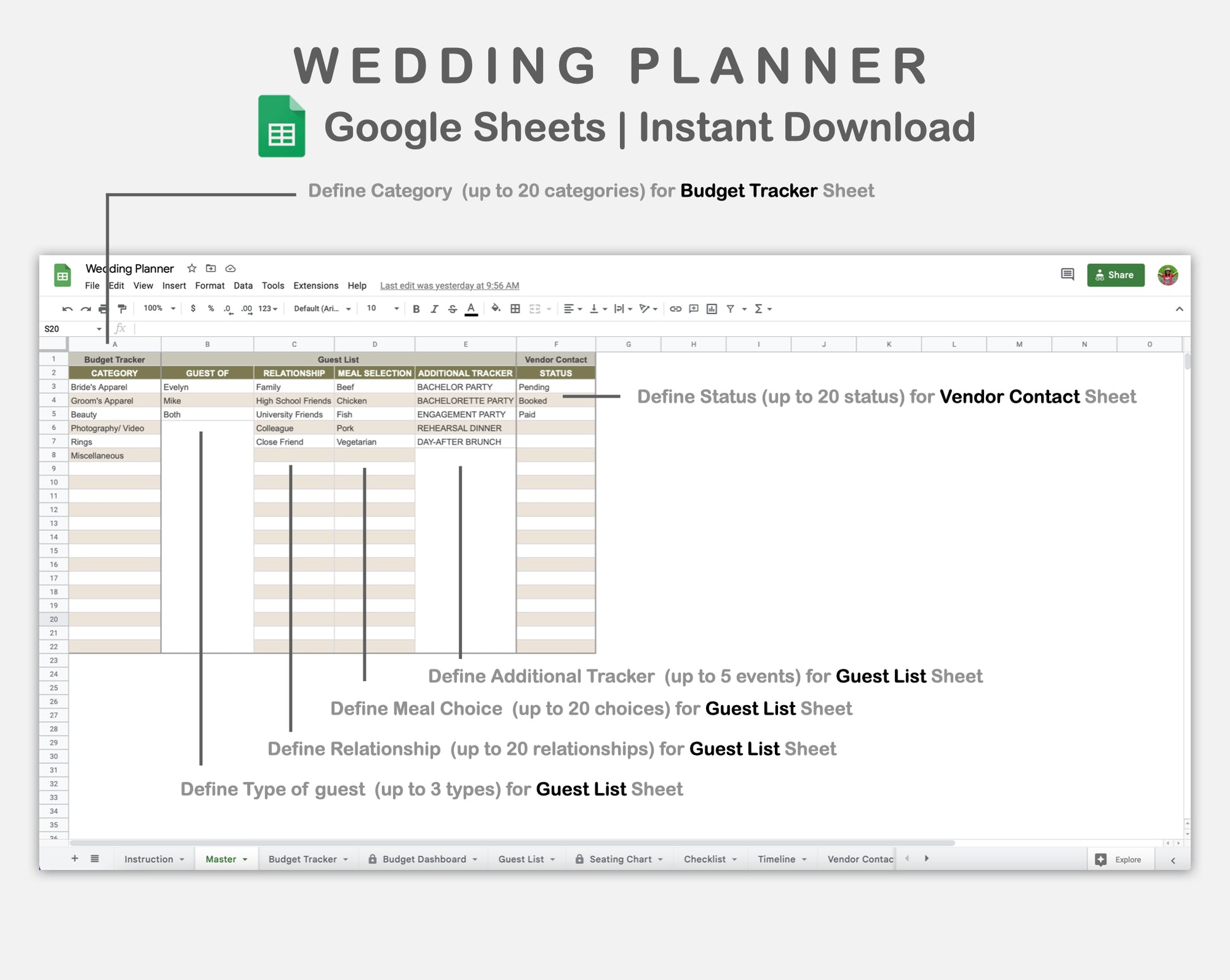 • There are 10 sheets: Instruction, Master, Budget Tracker, Budget Dashboard, Guest List, Seating Chart, Checklist, Timeline, Vendor Contact, and Formula.