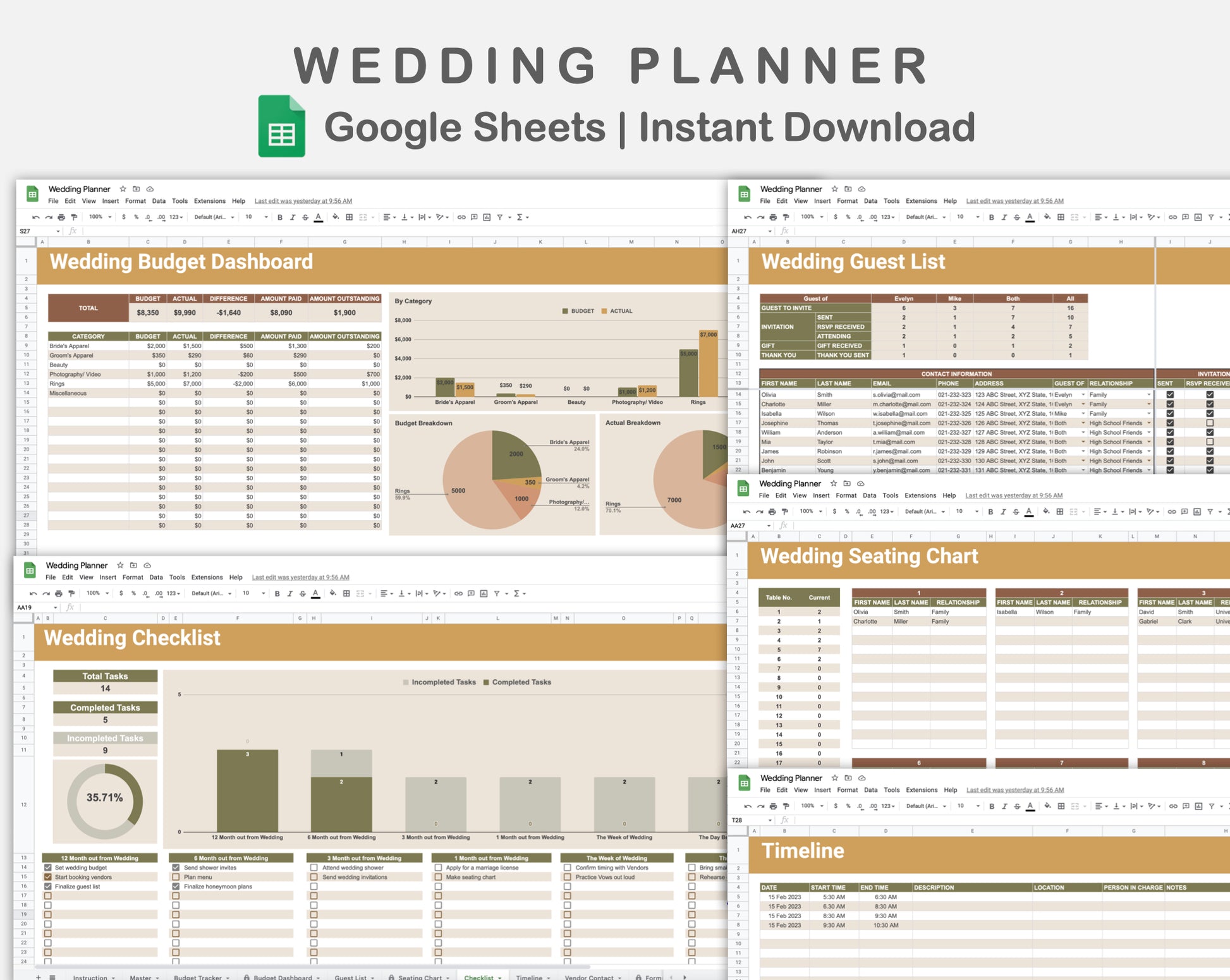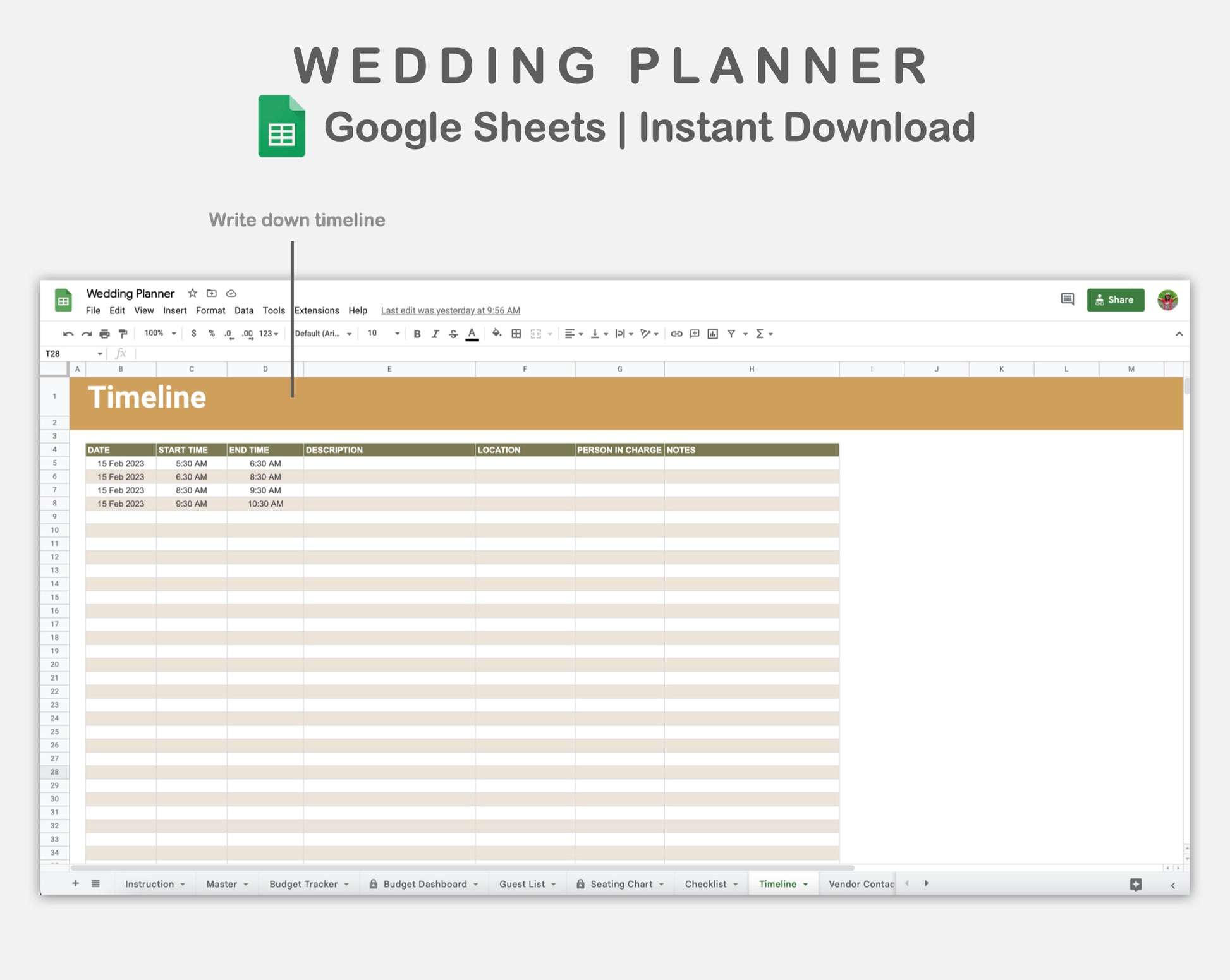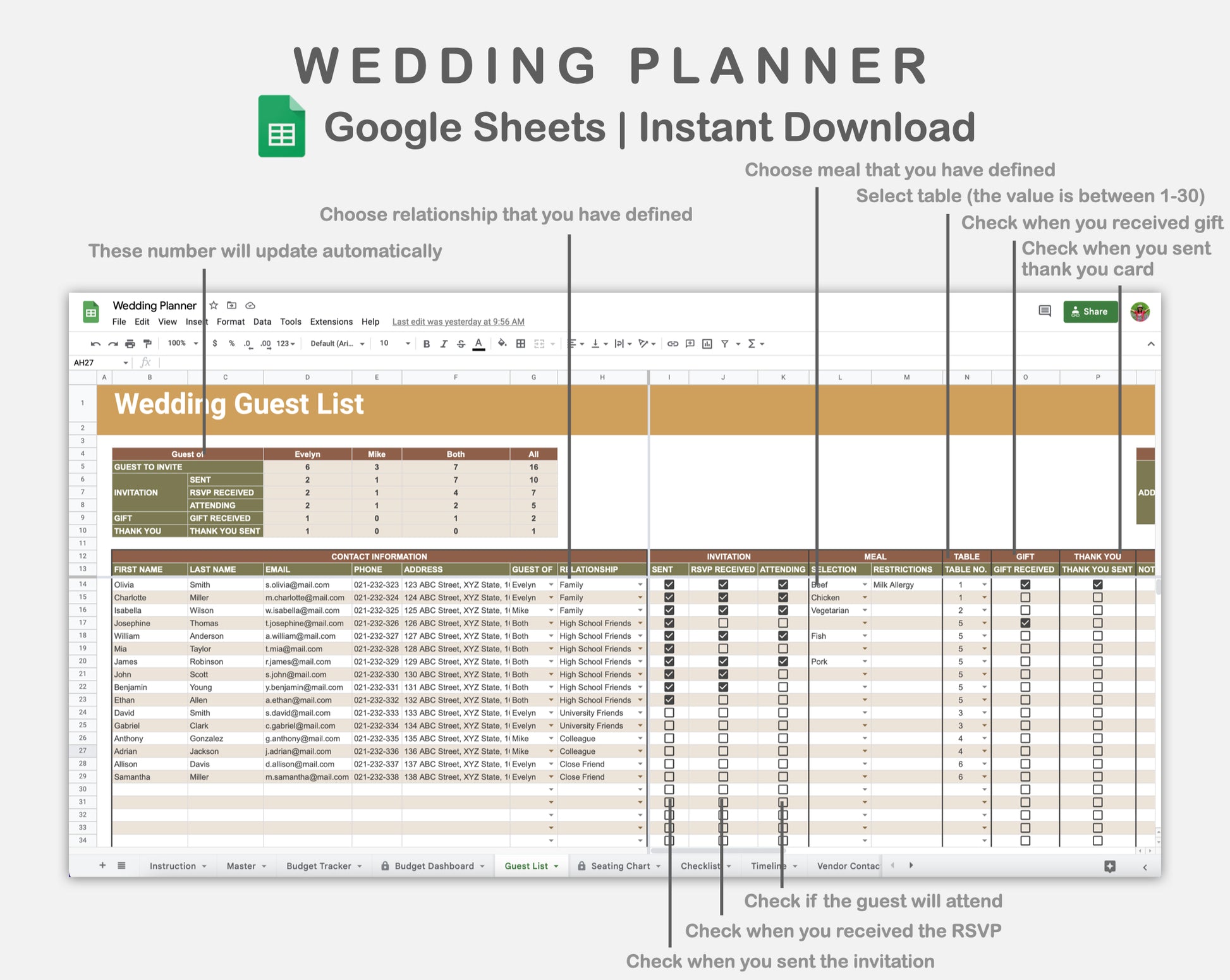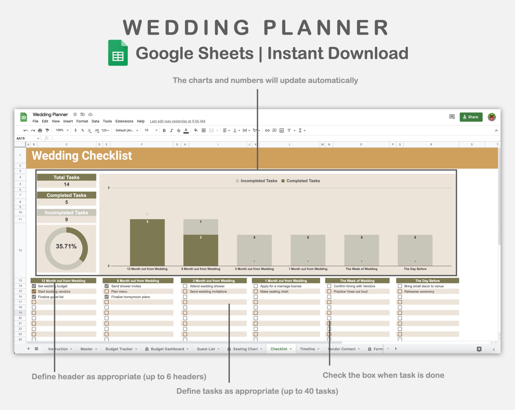 • There are 10 sheets: Instruction, Master, Budget Tracker, Budget Dashboard, Guest List, Seating Chart, Checklist, Timeline, Vendor Contact, and Formula.