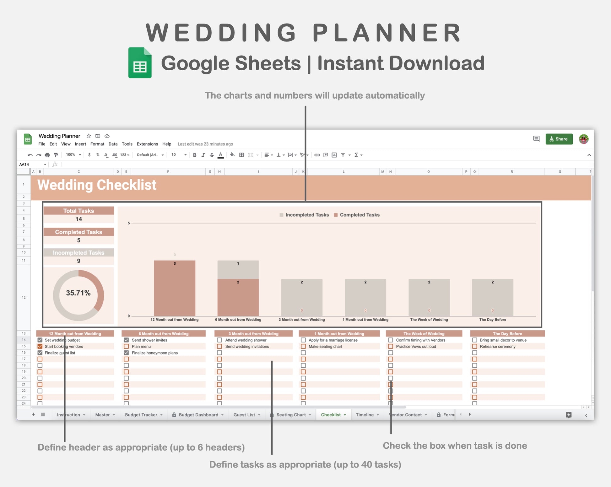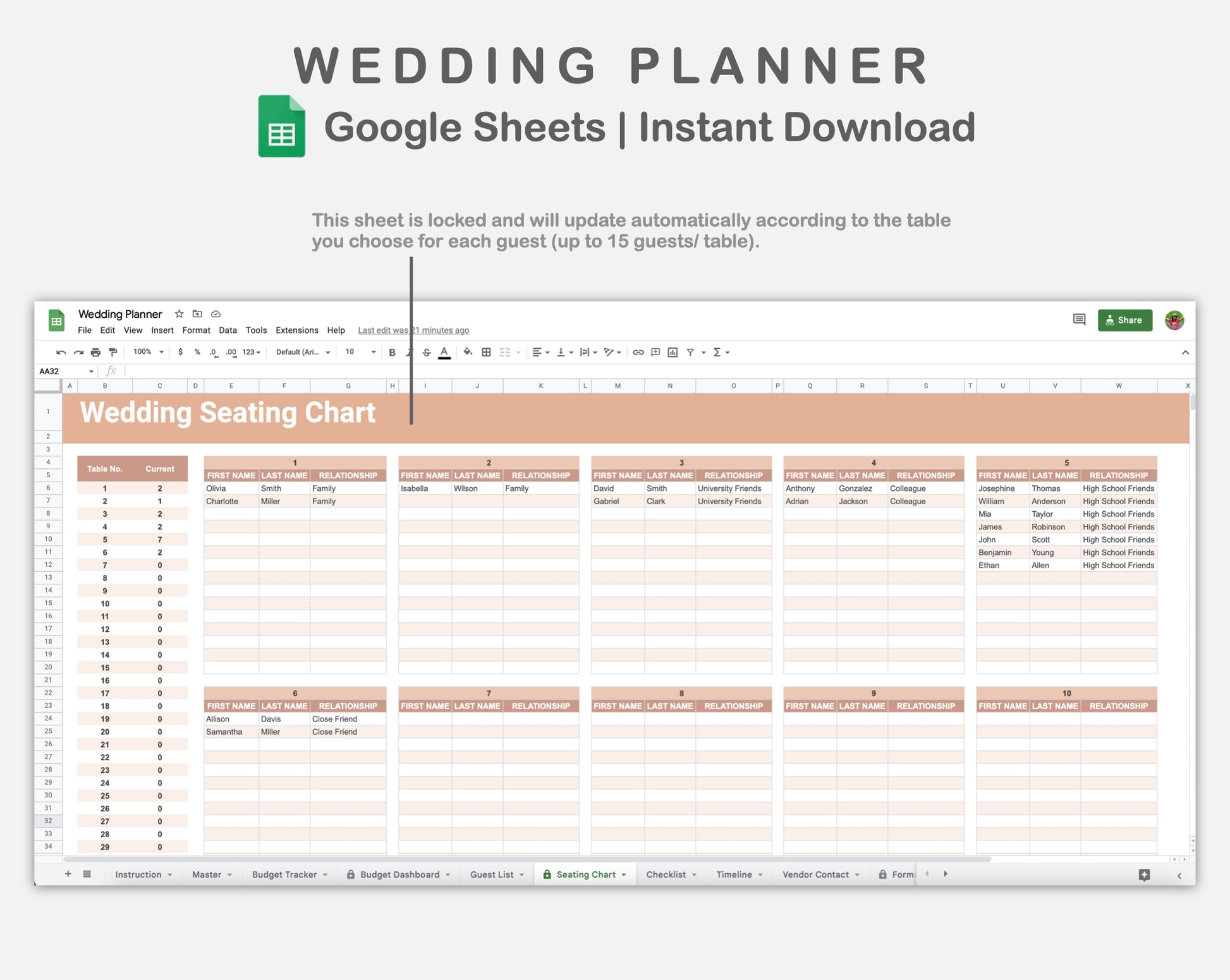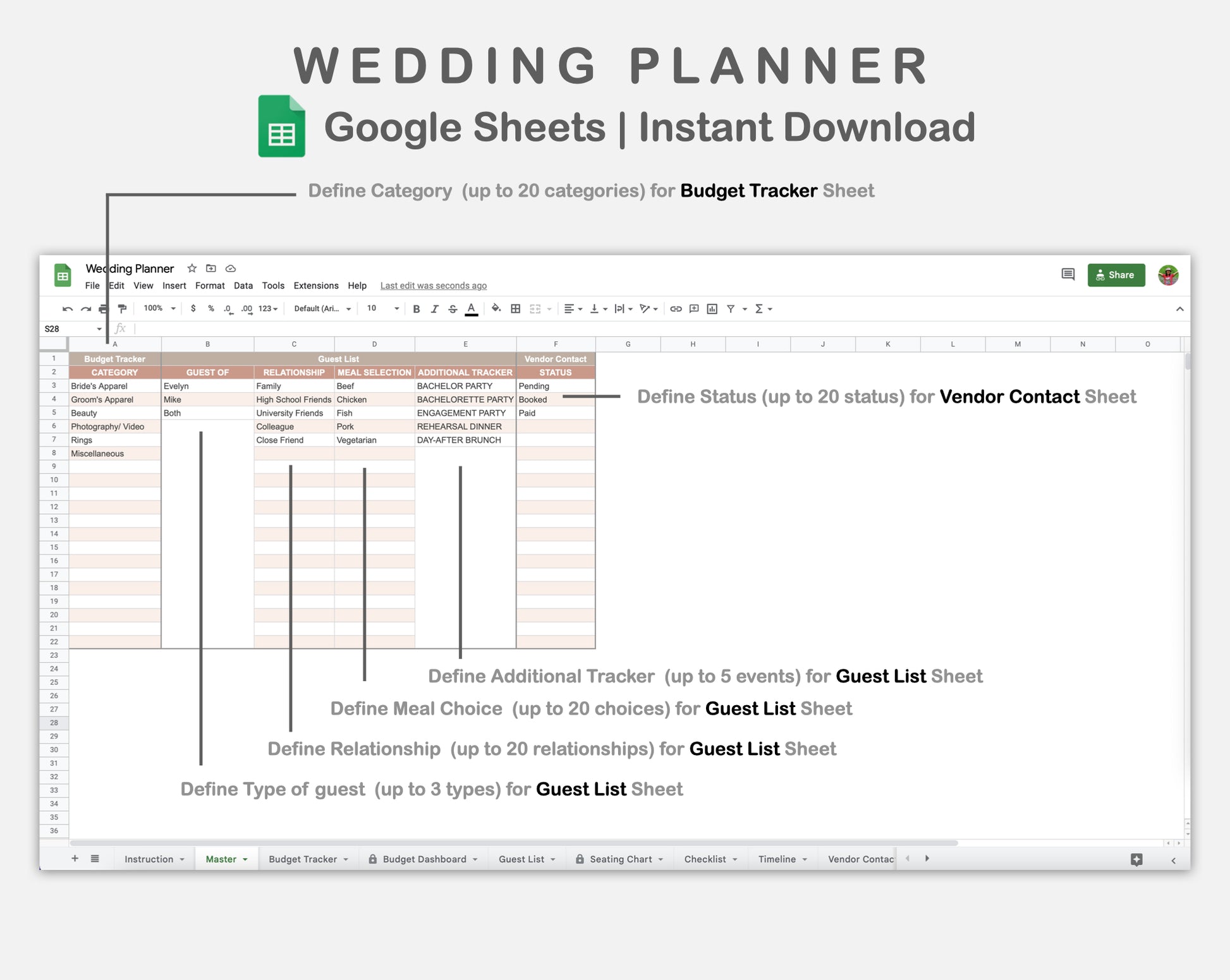 • There are 10 sheets: Instruction, Master, Budget Tracker, Budget Dashboard, Guest List, Seating Chart, Checklist, Timeline, Vendor Contact, and Formula.