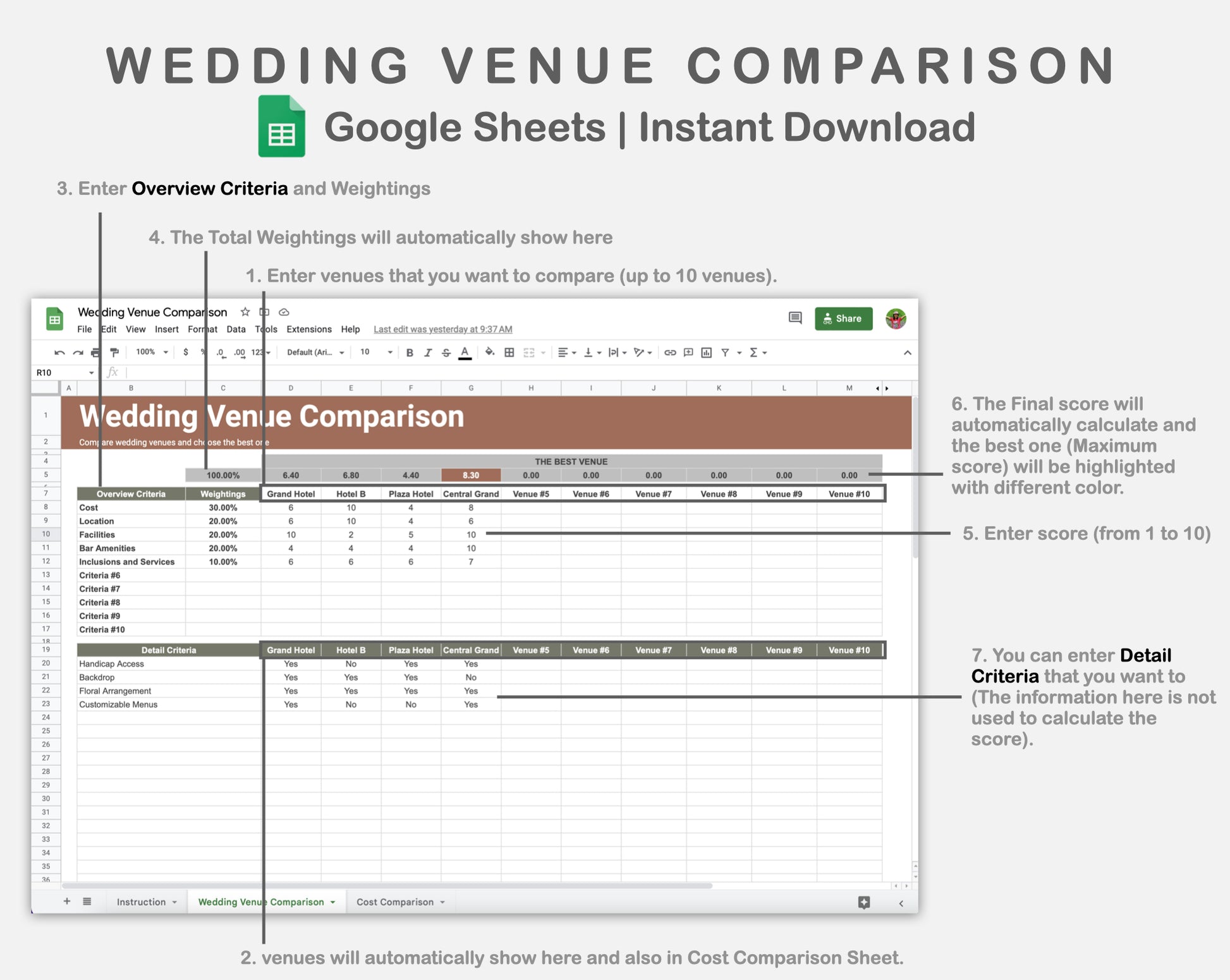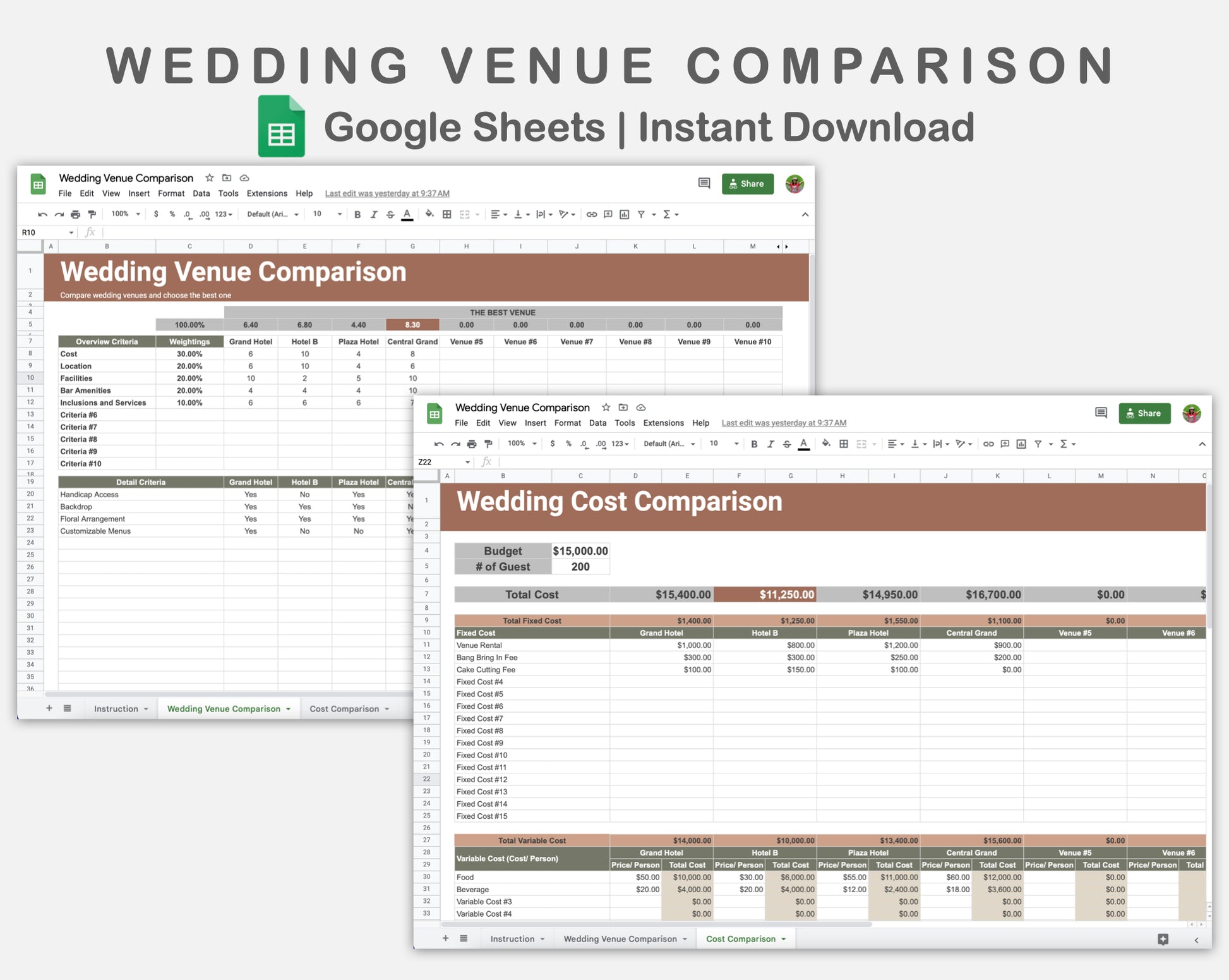 This Wedding Venue Comparison Spreadsheet for Google Sheets is made in EARTHY theme in order to help you compare wedding venues and choose the best one.