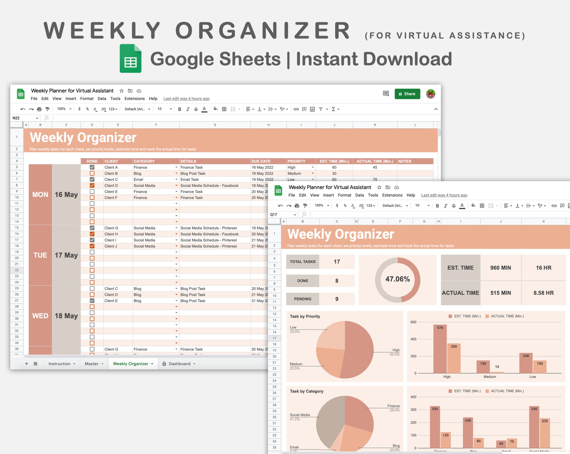 This Weekly Organizer for Virtual Assistant Spreadsheet for Google Sheets is made in NEUTRAL theme in order to help you plan weekly tasks for each client, set priority levels, estimate time and track the actual time for tasks