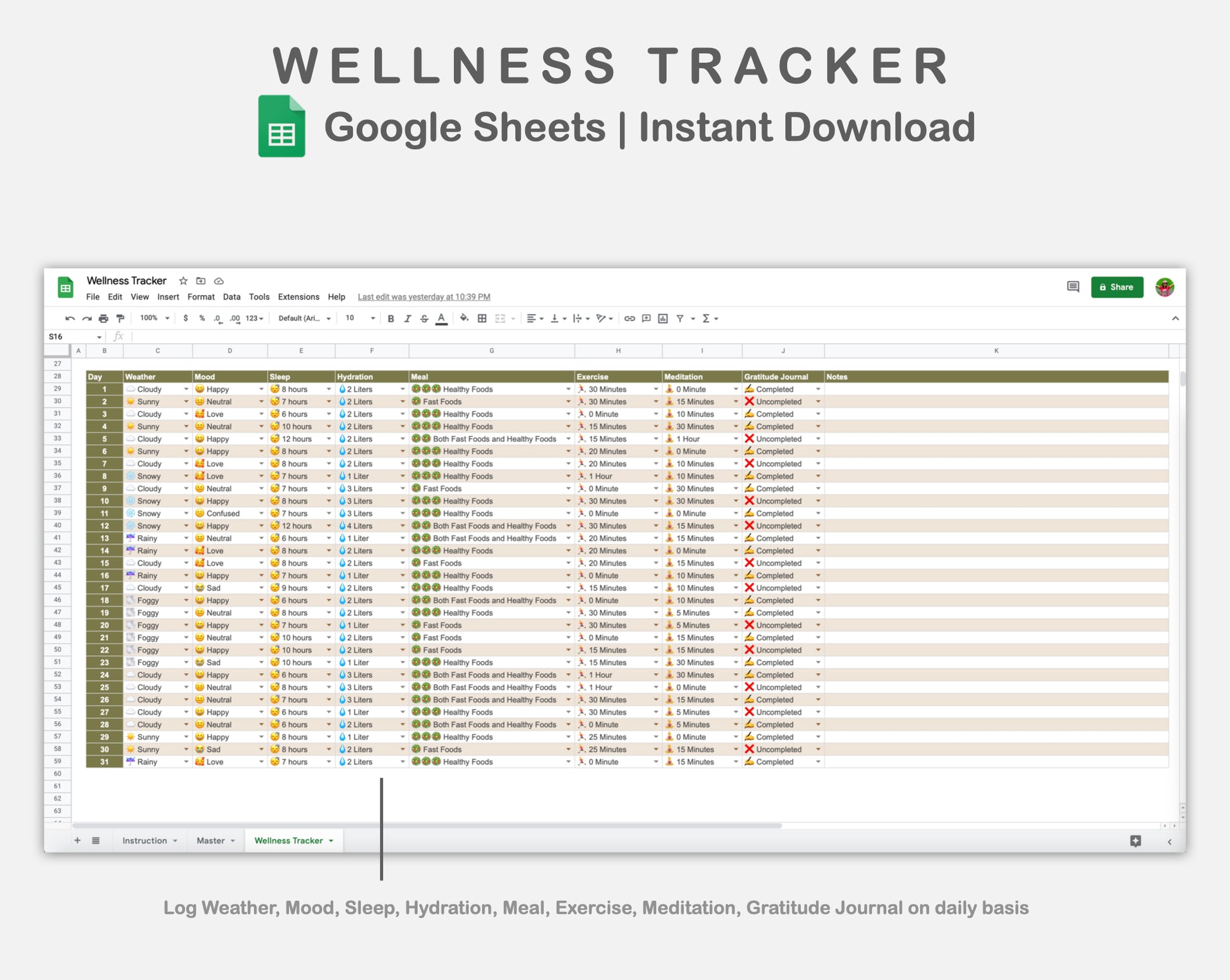 This Daily Wellness Tracker Spreadsheet for Google Sheets is made in BOHO theme in order to help you keep track of your day to day mood, sleep time, hydration, meditation, and more.