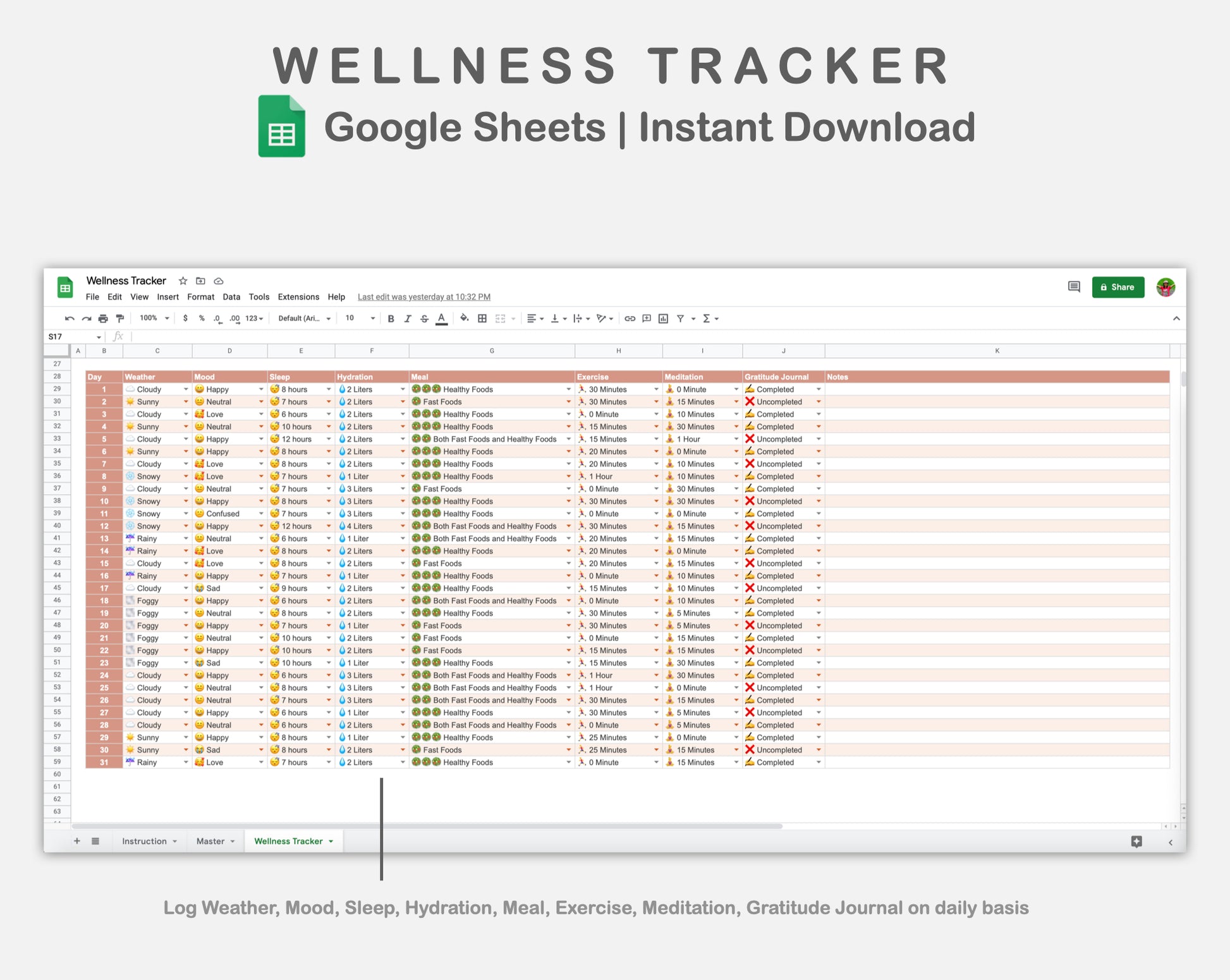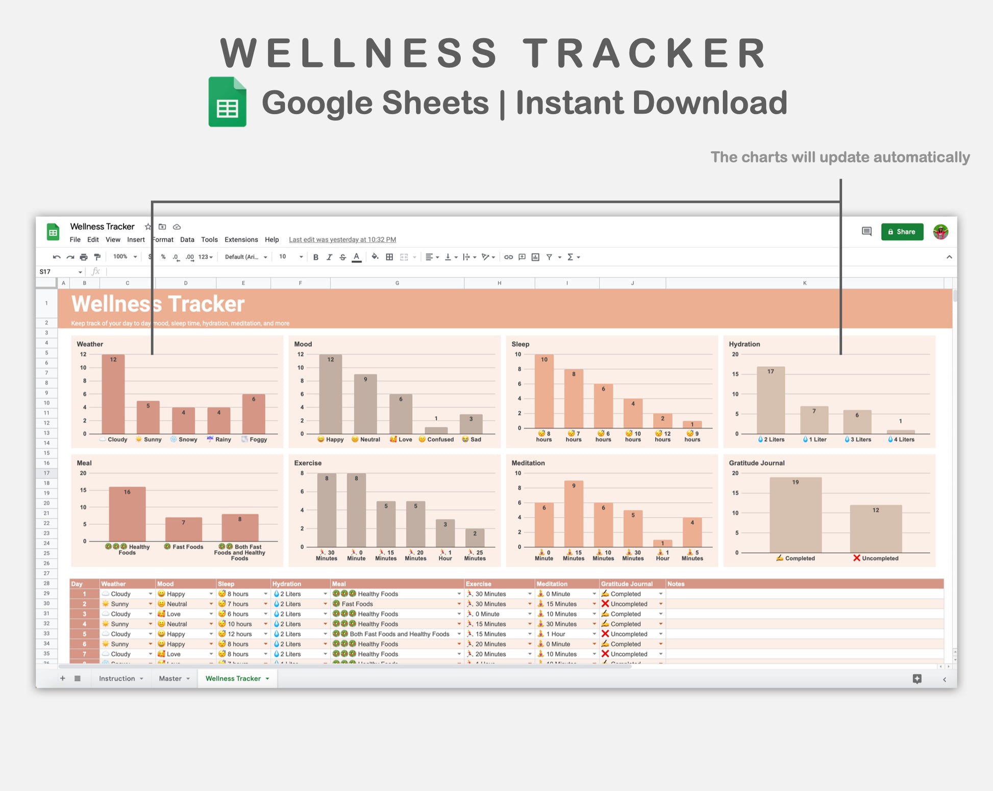This Daily Wellness Tracker Spreadsheet for Google Sheets is made in NEUTRAL theme in order to help you keep track of your day to day mood, sleep time, hydration, meditation, and more.