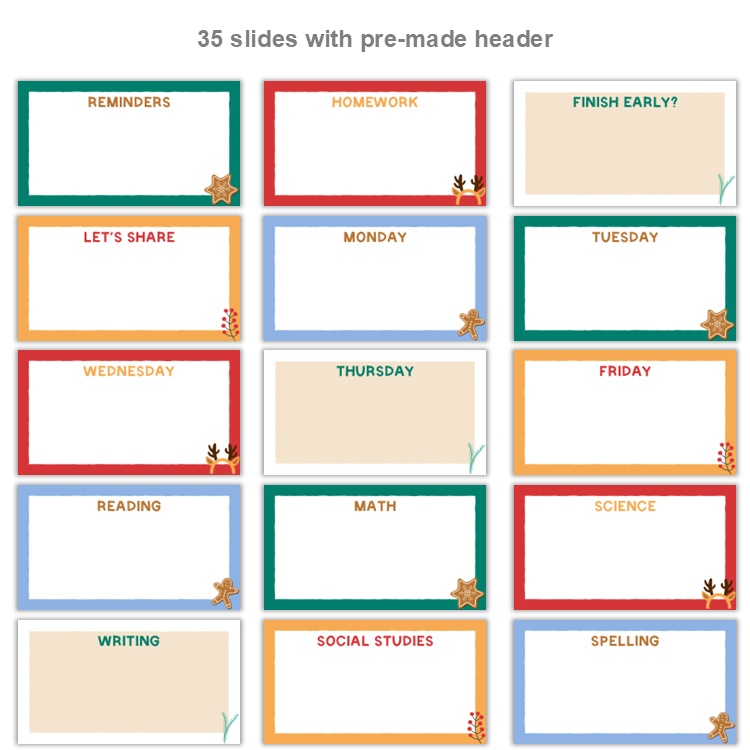 This listing is for 50 pre-made slides with a Bright Christmas Theme that can be used for PowerPoint and Google Slides.