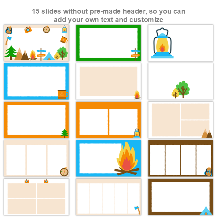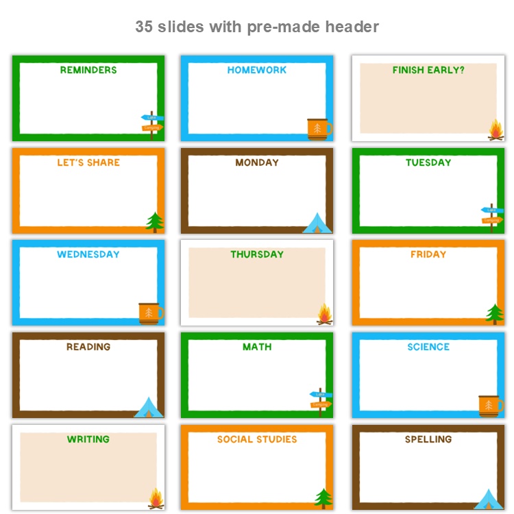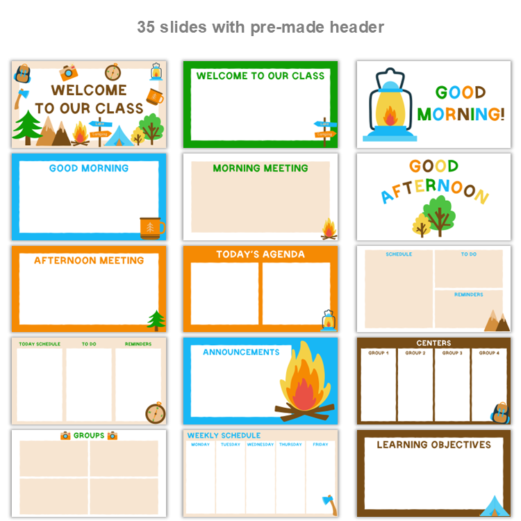 This listing is for 50 pre-made slides with a Camping Theme that can be used for PowerPoint and Google Slides.
