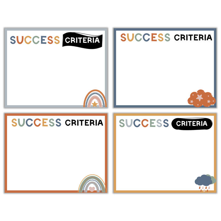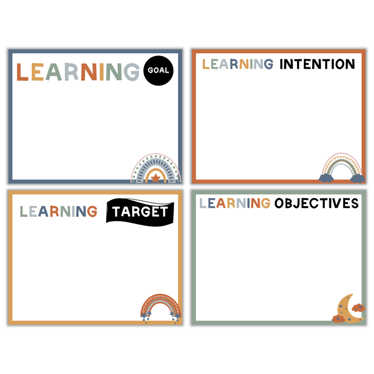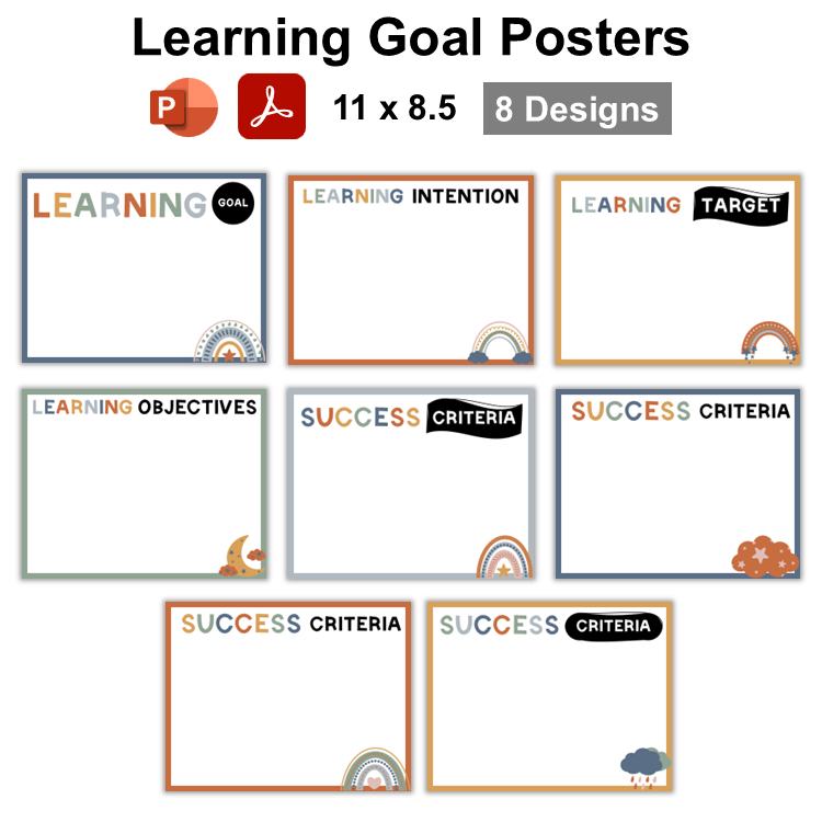 This listing is for a ready-to-print set of learning goal posters with Neutral Rainbow Theme and an editable template. There are 8 designs in the set with the following headers: