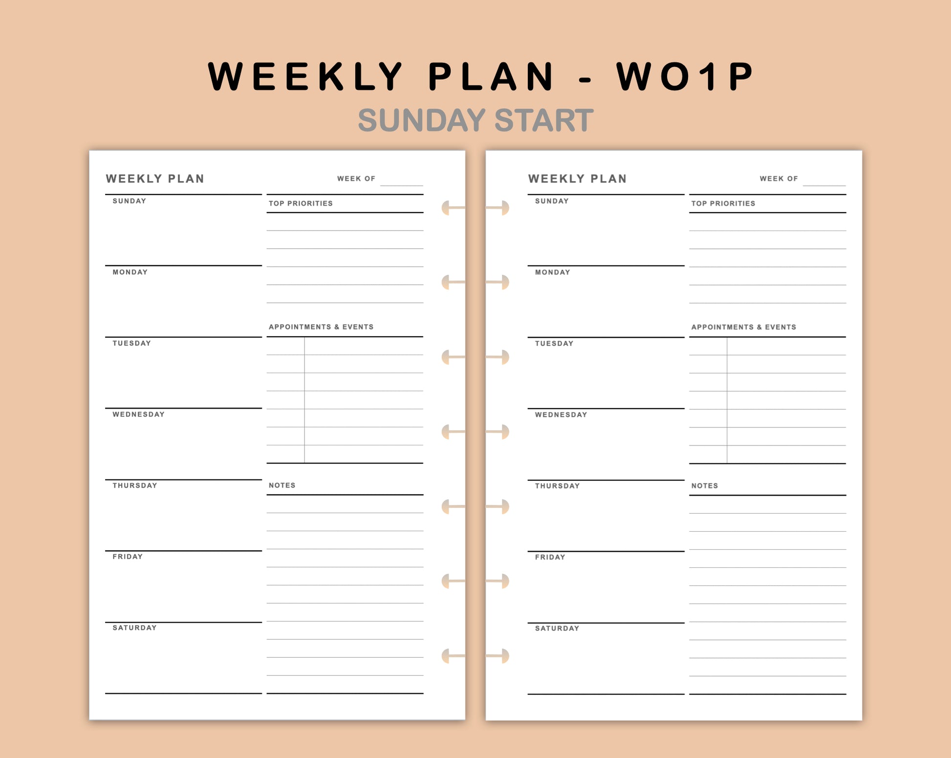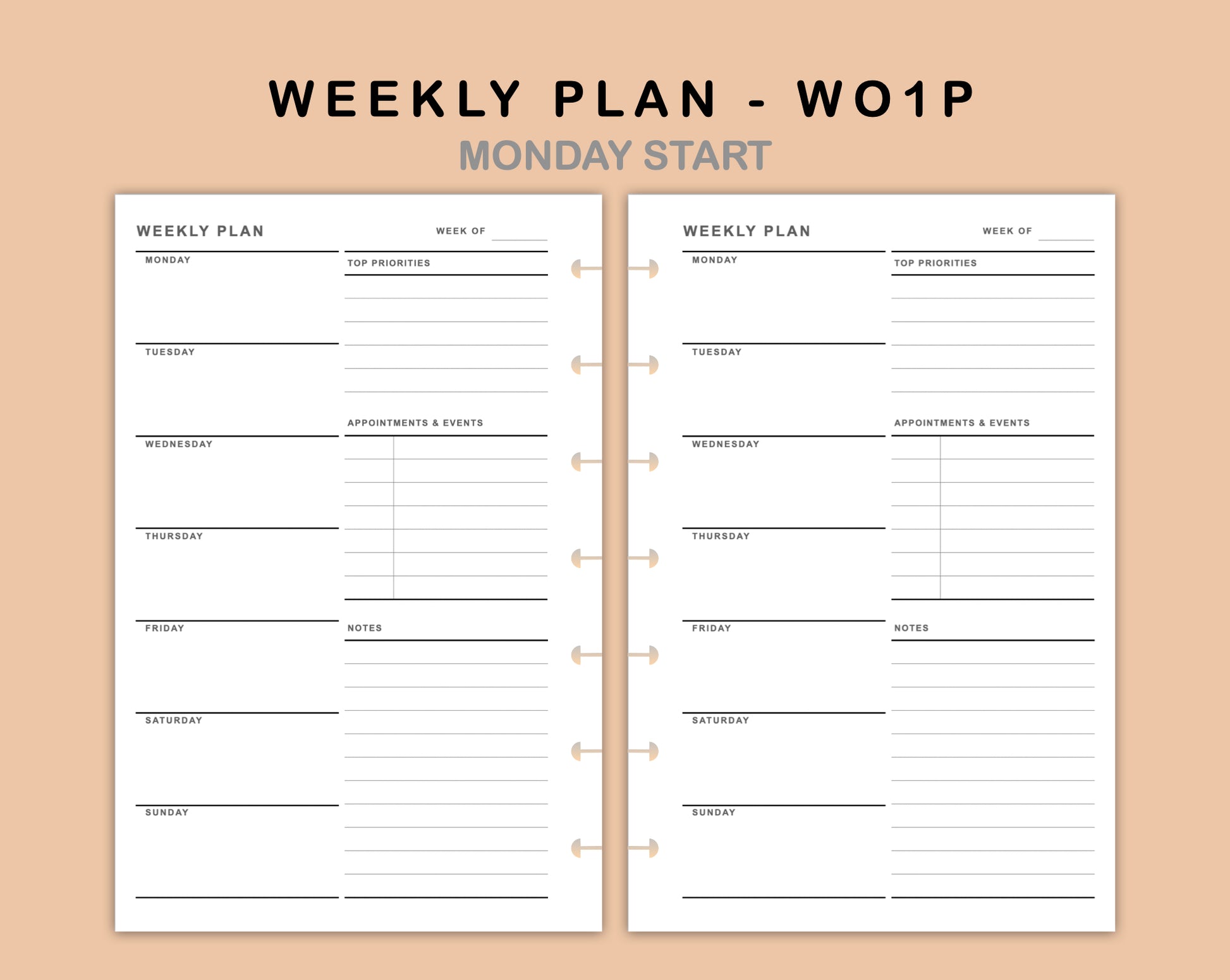 This Undated Weekly Planner Inserts (Week on 1 page) is made to help you plan and manage tasks in a week. The planner has top priorities, appointments & events, and notes section. It is available in both Monday start and Sunday start.