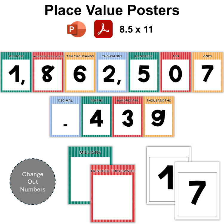 • 1 PDF file containing ready-to-print place value posters (11 Pages) and interactive posters (31 pages).