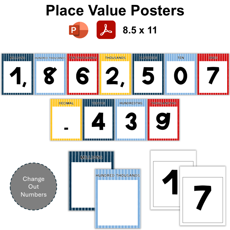 This listing is for a ready-to-print set of place value posters with Nautical Theme and an editable template. These posters include millions, hundred thousands, ten thousands, thousands, hundreds, tens, ones / units, decimal, tenths, hundredths, thousandths. And, support 2 styles of display: Place Value Numbers Display, and Interactive Place Value Display.