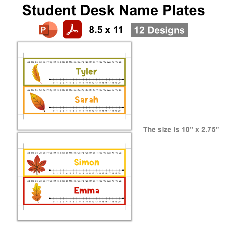 This listing is for a ready-to-print set of student desk plates with Autumn Leaves Theme and an editable template. There are 12 designs in this template.