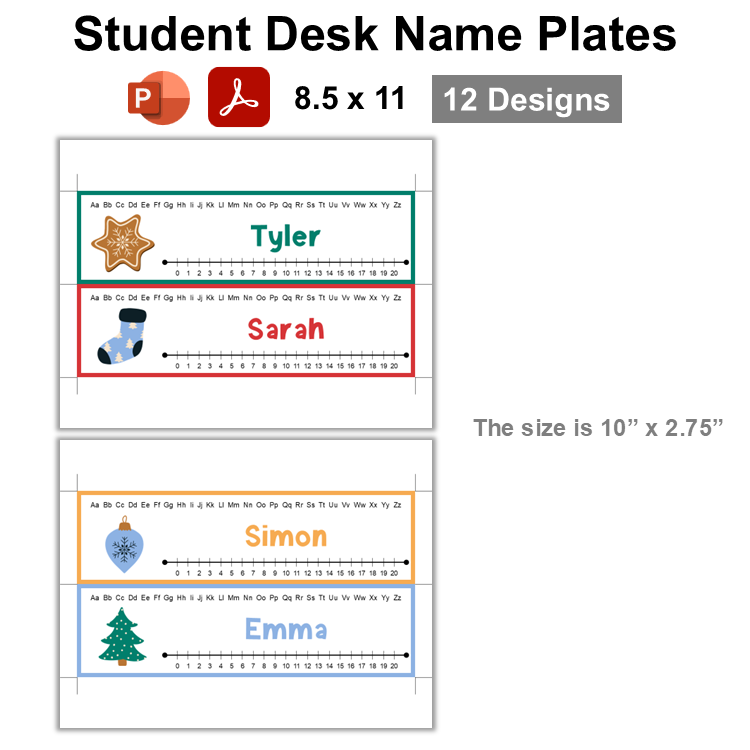 This listing is for a ready-to-print set of student desk plates with Bright Christmas Theme and an editable template. There are 12 designs in this template.