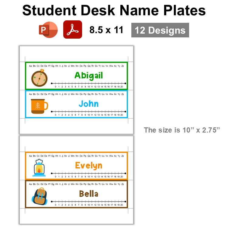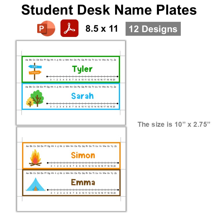 This listing is for a ready-to-print set of student desk plates with Camping Theme and an editable template. There are 12 designs in this template.