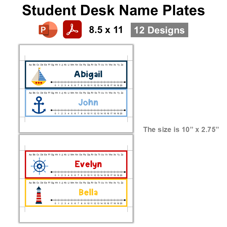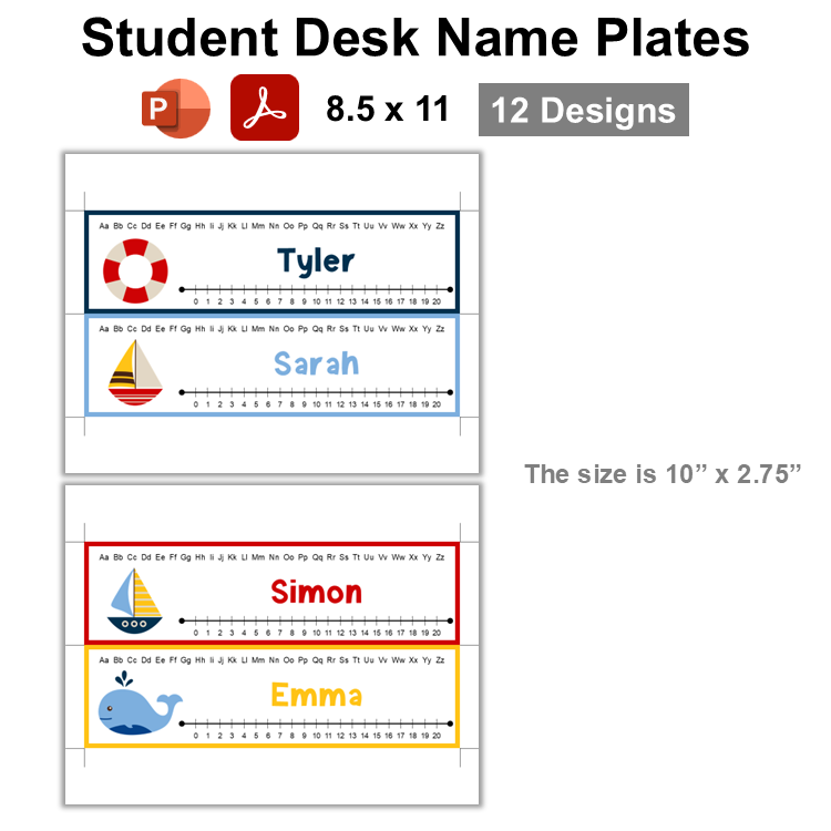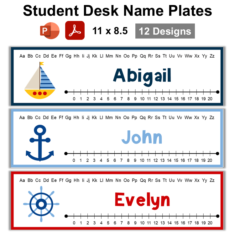This listing is for a ready-to-print set of student desk plates with Nautical Theme and an editable template. There are 12 designs in this template.