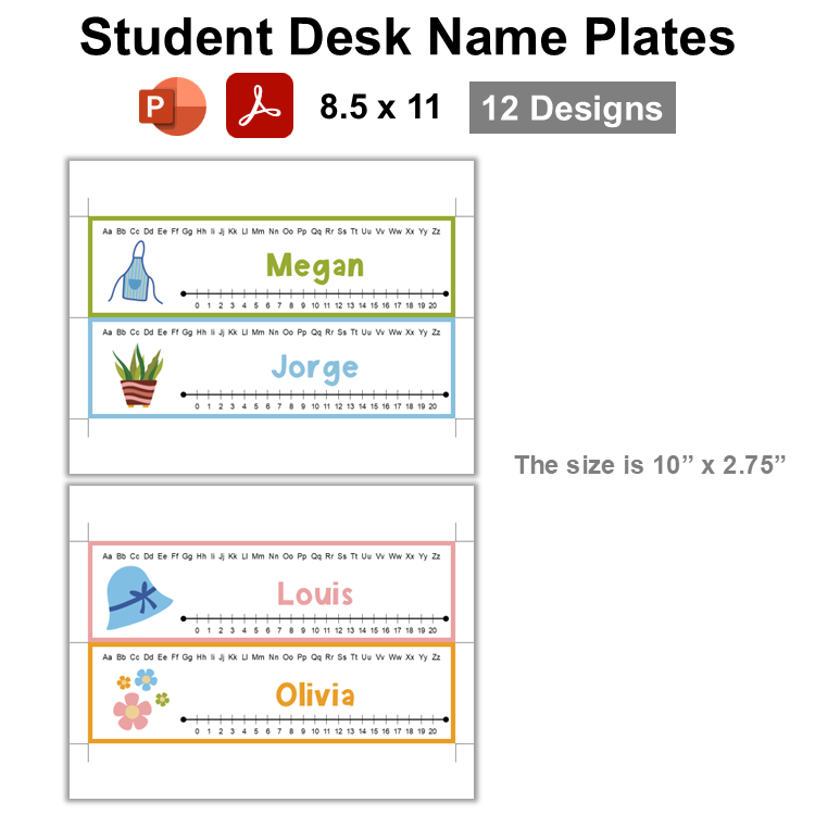 • 1 PDF file containing ready-to-print desk plates (12 Pages).