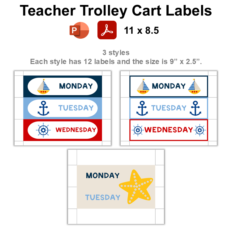 This listing is for an editable template of Teacher Trolley Cart Labels with Nautical Theme.