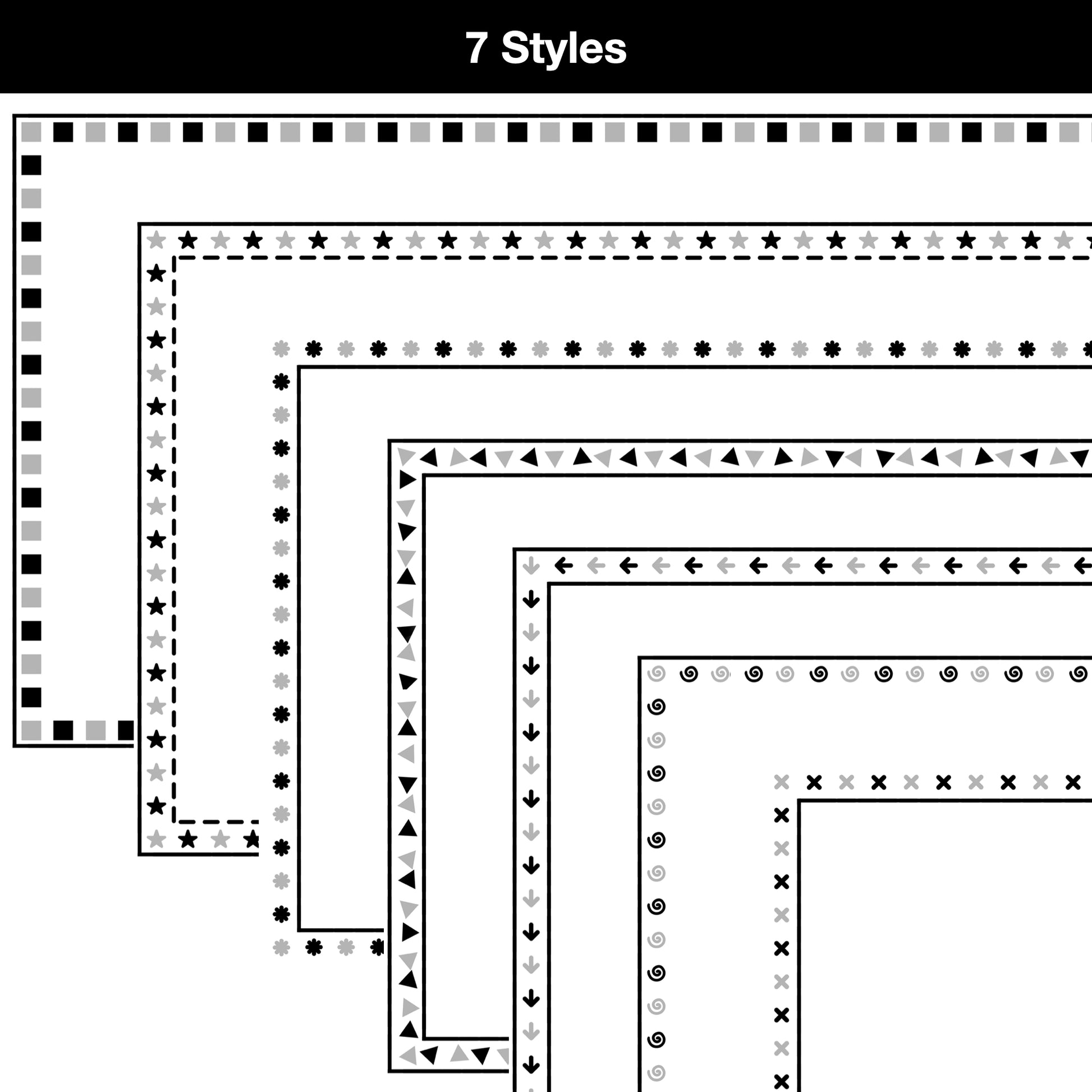 - 49 borders total. 7 border styles in 7 colors.
