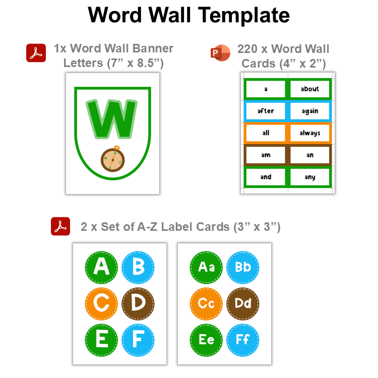 • 1 PDF file containing a ready-to-print Word Wall Banner Letters and 2 sets of A-Z Label Cards (18 Pages).